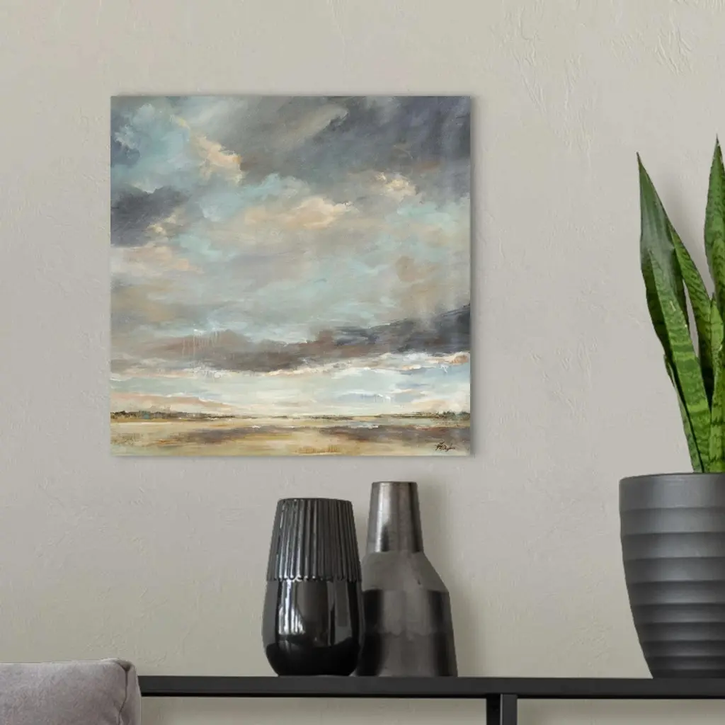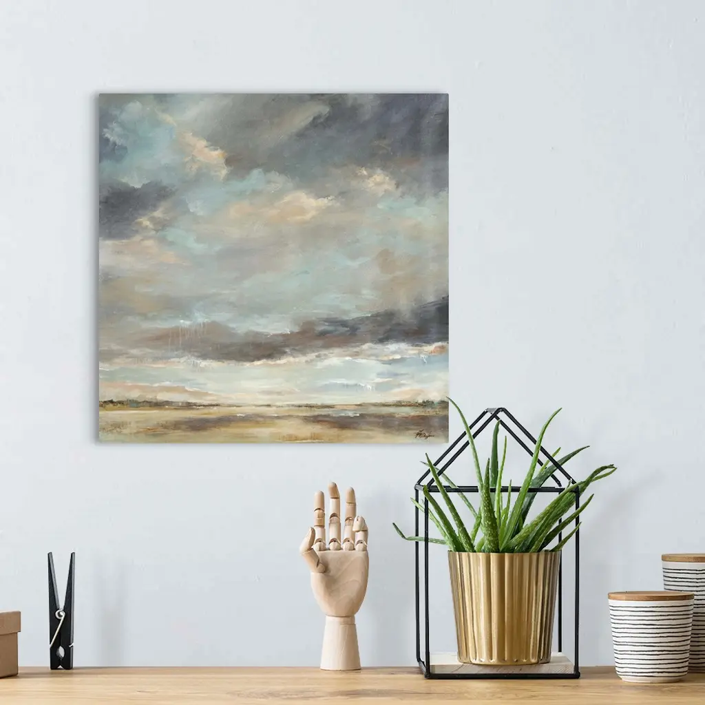 Abstract painting of storm clouds moving into a thick sky of clouds over a vast, empty landscape.