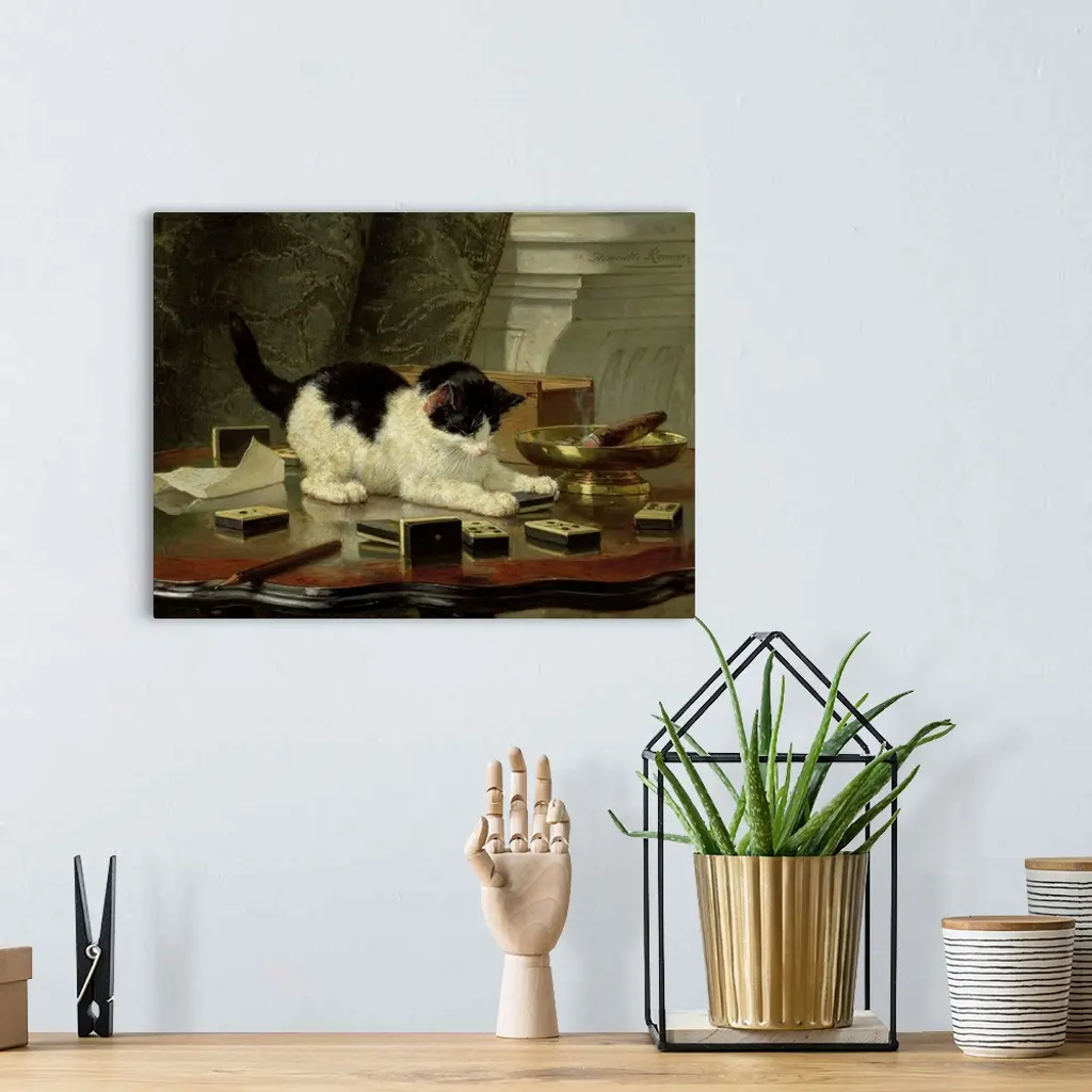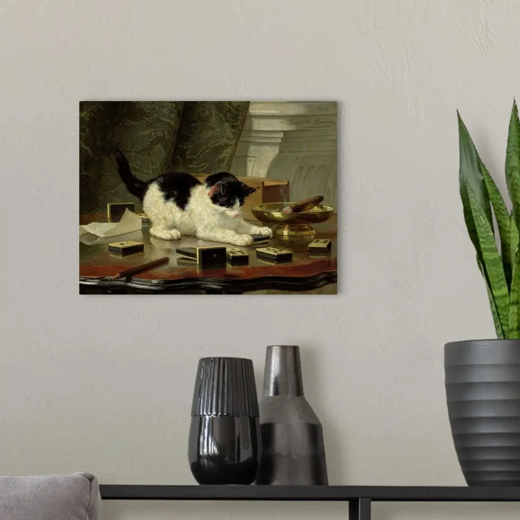 The Cat at Play, by Henriette Ronner, c. 1860-78, Belgian-Dutch painting on panel. Black and white cat on a table with a dominoes in its paws.