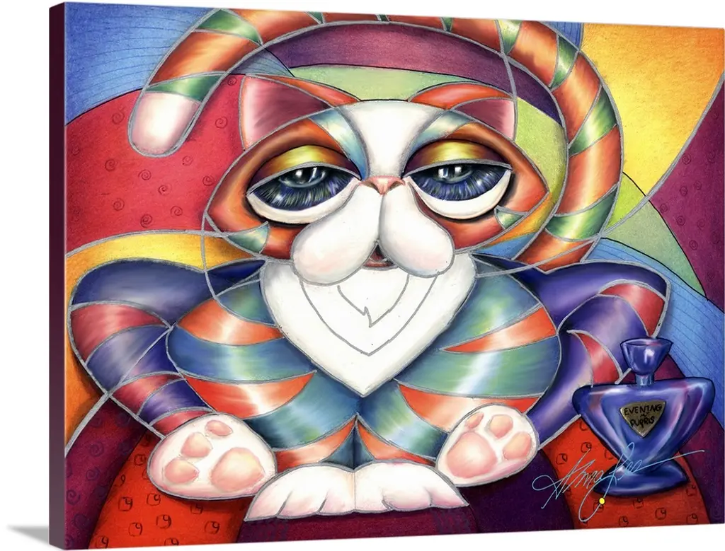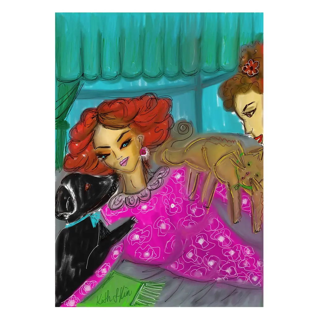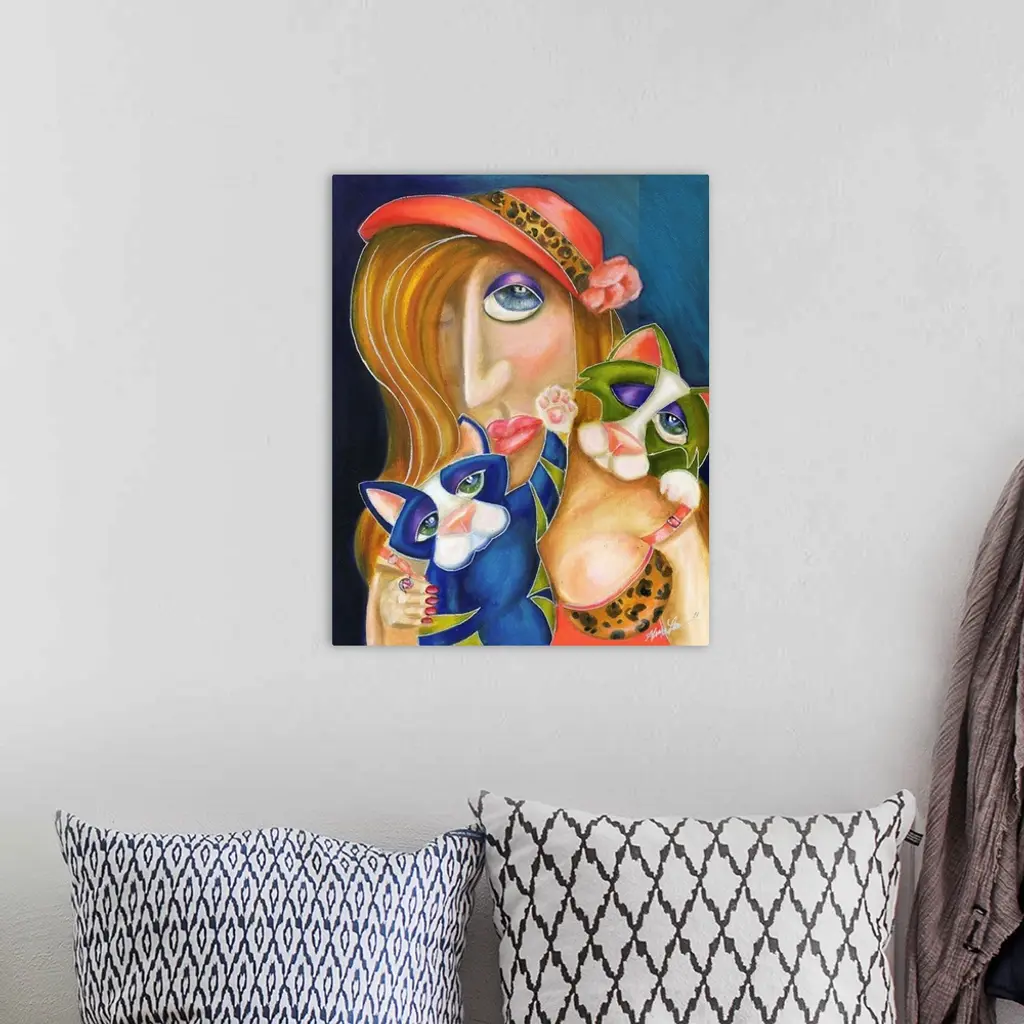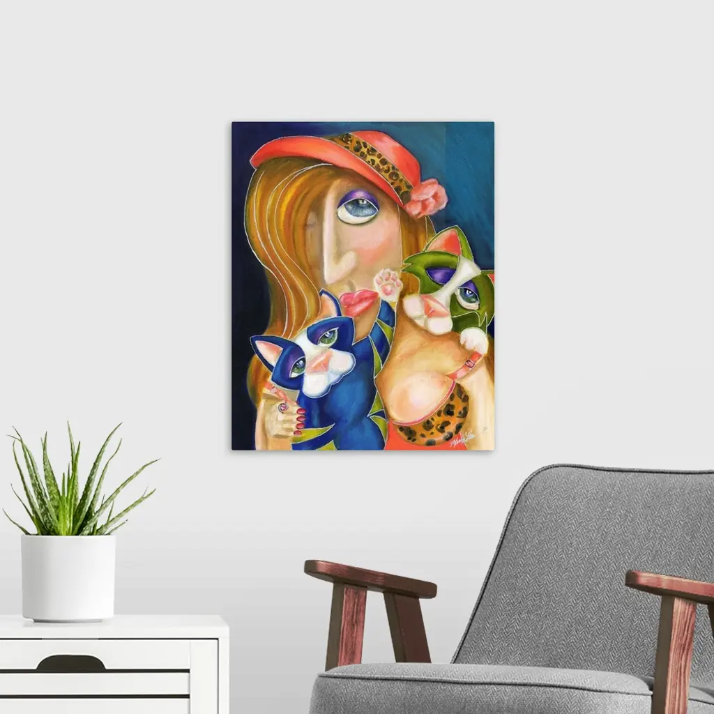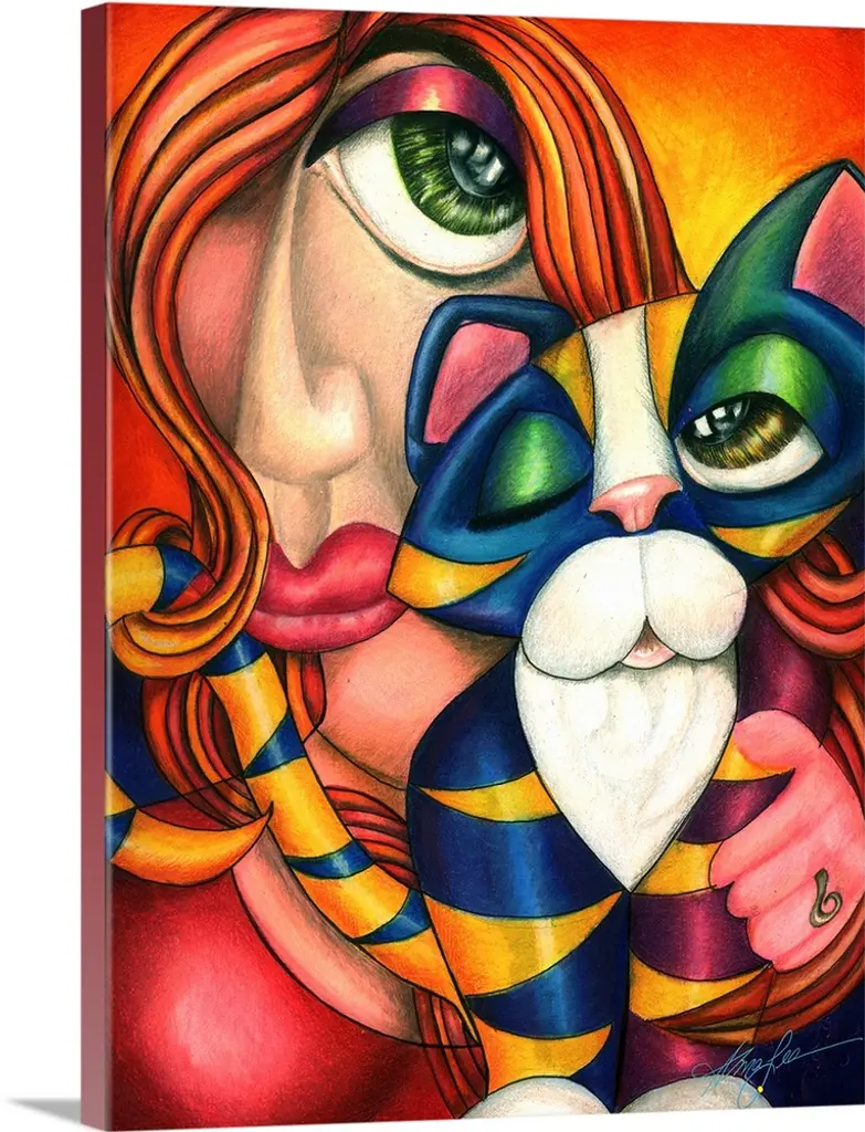 Contemporary artwork in the style of cubism of a woman with two cats in bold colors.
