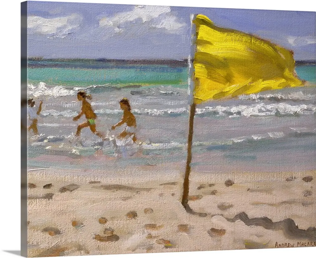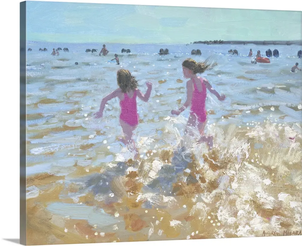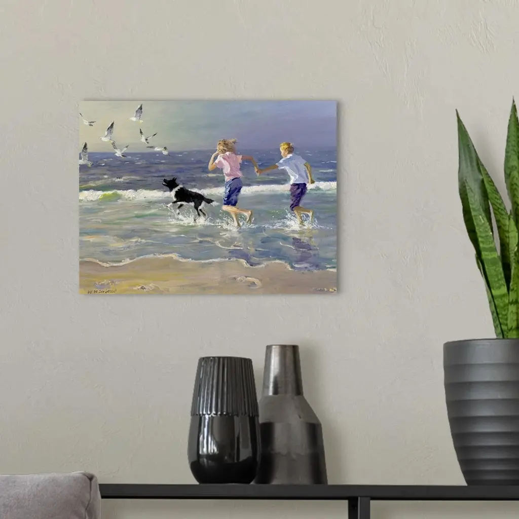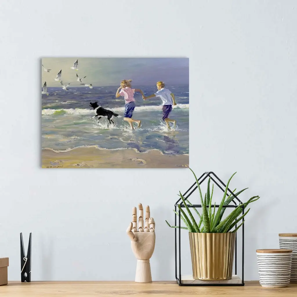 Painting of two children holding hands running on the beach as a dog chases birds in front of them. Cool tones dominate.