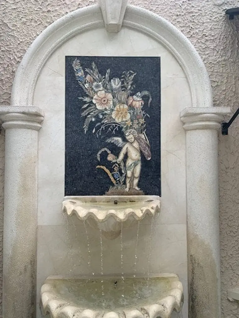 Introducing "The Cherub Of Flowers Mosaic" – a stunning piece of artistry that brings a touch of elegance and charm to any space. This exquisite handcrafted mosaic features a delightful cherub, lovingly crafted to hold a large bouquet of vibrant, colorful flowers. Each element of this artwork is meticulously fashioned from premium quality all-natural stones and decorative tiles, ensuring that no two pieces are exactly alike. The cherub, a timeless symbol of love and innocence, is depicted in intricate detail, skillfully conveying a sense of whimsy and joy. The use of bright, dynamic colors in the bouquet not only captivates the eye but also brings an uplifting energy to your home décor. This mosaic is perfect for those seeking to infuse their interiors with a touch of classic beauty and sophisticated luxury. Notably, the mosaic showcases exotic Blue Bahia stones, celebrated for their rare azure tones and oceanic brilliance. These deep cerulean hues evoke tropical blue luxury, adding a dazzling, vibrant dimension to the composition. Complementing this is the radiant Brown Quartz, whose luminous crystalline structure emits a shimmering, jewel-like glow with prismatic translucence. Together, these exotic materials elevate the mosaic’s visual allure, creating a captivating interplay of color and texture that is silky and cool to the touch. Each mosaic is crafted with a commitment to quality and craftsmanship, highlighting the dedication of artisans who pour their heart and soul into every piece. Whether displayed in your living room, hallway, or as a statement piece in your garden, "The Cherub Of Flowers Mosaic" invites admiration and warmth. This decorative artwork makes an exceptional gift for loved ones who appreciate unique homespun artistry or for anyone who cherishes the charm of classical motifs. Transform your surroundings into a haven of beauty and elegance with this one-of-a-kind mosaic that tells a story of love and nature through its enchanting design. Celebrate the beauty of craftsmanship and nature in your home with "The Cherub Of Flowers Mosaic" – a stunning masterpiece that will be treasured for years to come.