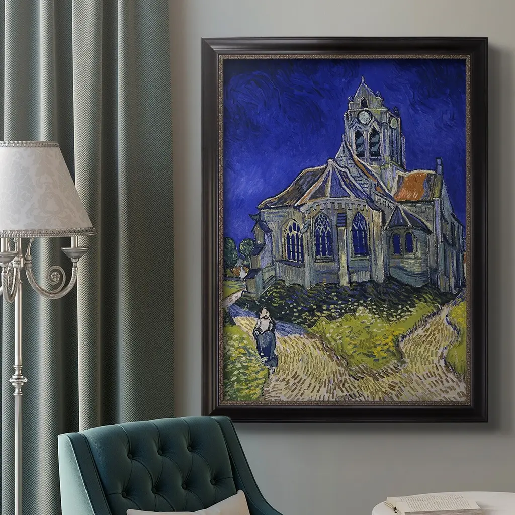 the church at auvers Premium Framed Canvas- Ready to Hang A Premium Framed Canvas created to last. Framed in distressed wood and available in an array of sizes and colors Featuring a beveled a solid wood stretcher bar, each piece comes ready to hand 3 SIZES AVAILABLE 16''X20'' - Overall Size 18'X27'' - Overall Size 24''x36'' - Overall Size Each piece is made to order. Each piece comes with hanging hardware. Made in the USA Ready to Hang Giclee Paper Print Acrylic Glass Beveled Matt Board