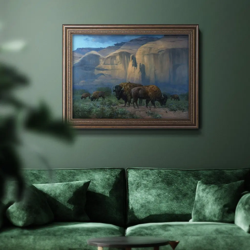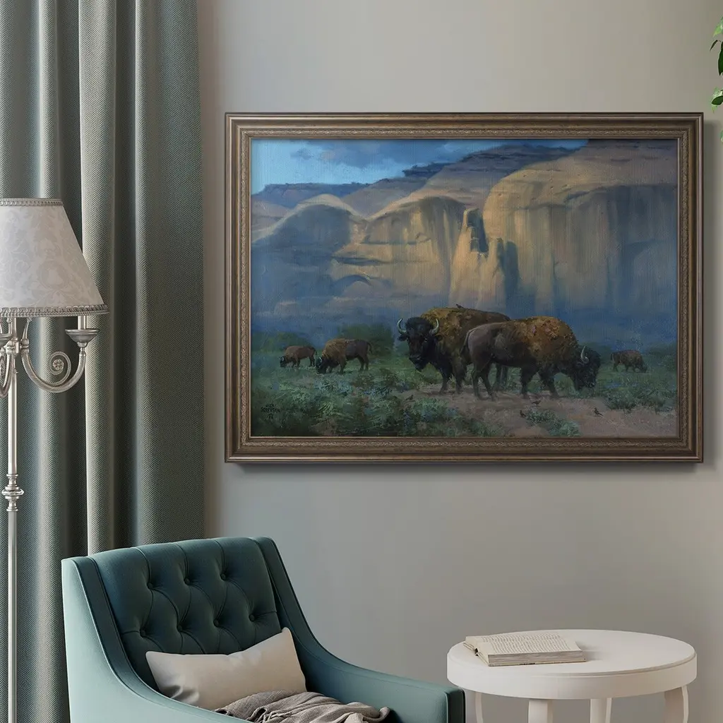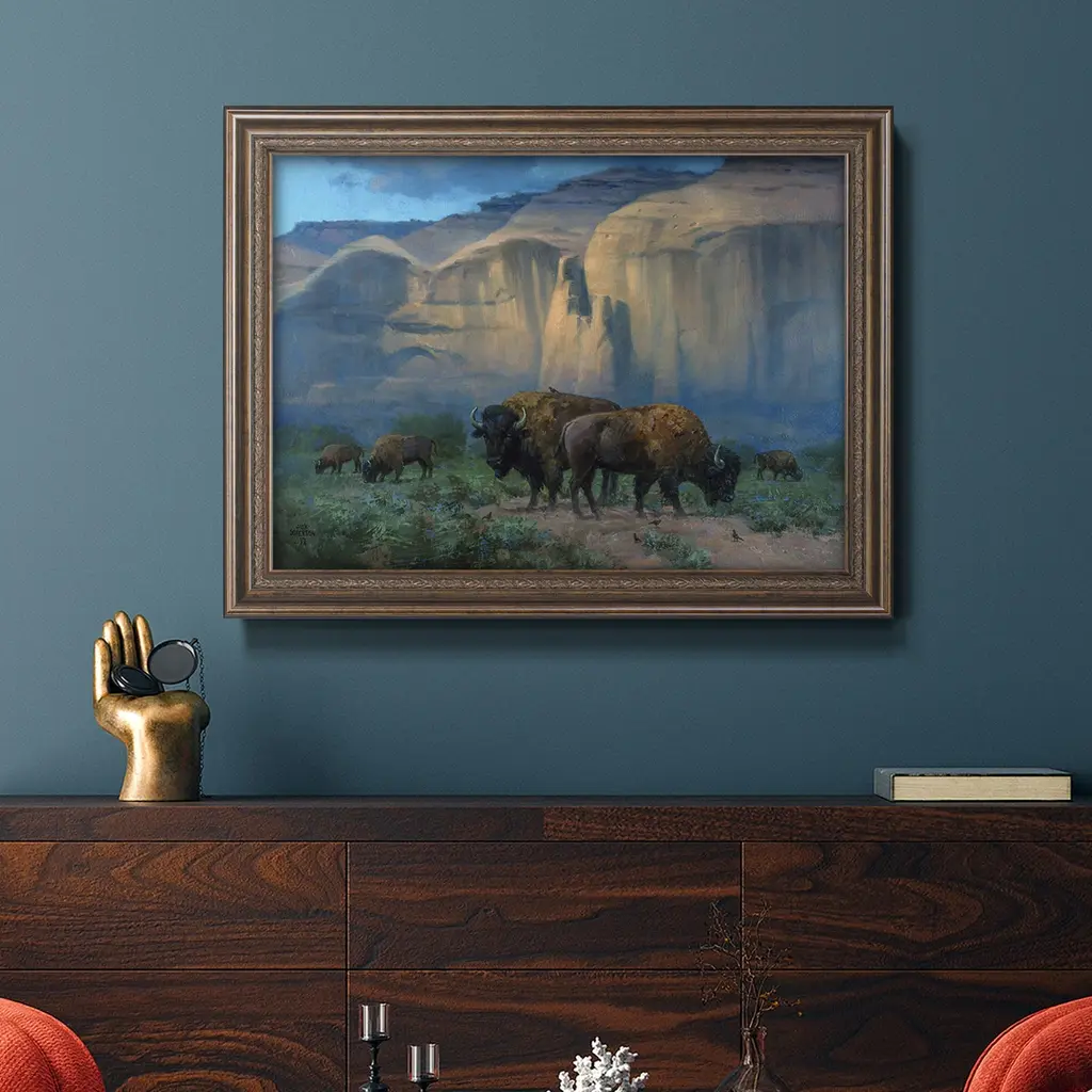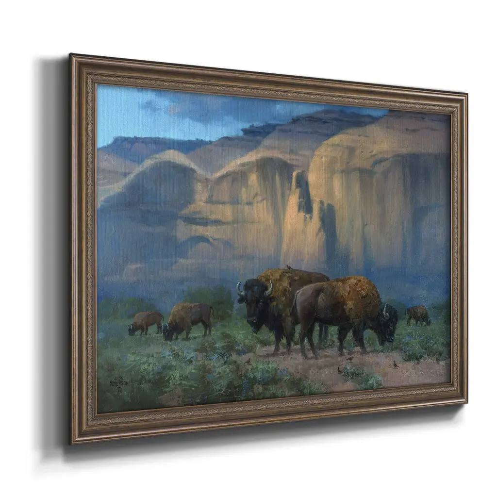 The Classic West Premium Framed Canvas- Ready to Hang A Premium Framed Canvas created to last. Framed in distressed wood and available in an array of sizes and colors Featuring a beveled a solid wood stretcher bar, each piece comes ready to hand 3 SIZES AVAILABLE 16''X20'' - Overall Size 18'X27'' - Overall Size 24''x36'' - Overall Size Each piece is made to order. Each piece comes with hanging hardware. Made in the USA Ready to Hang Giclee Paper Print Acrylic Glass Beveled Matt Board
