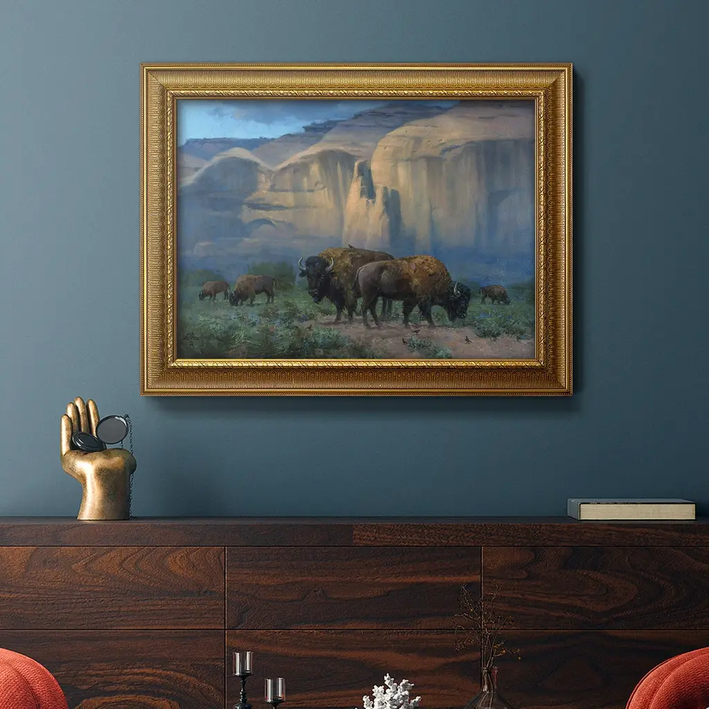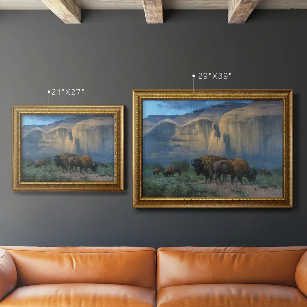 The Classic West Premium Framed Canvas- Ready to Hang A Premium Framed Canvas created to last. Framed in distressed wood and available in an array of sizes and colors Featuring a beveled a solid wood stretcher bar, each piece comes ready to hand 3 SIZES AVAILABLE 16''X20'' - Overall Size 18'X27'' - Overall Size 24''x36'' - Overall Size Each piece is made to order. Each piece comes with hanging hardware. Made in the USA Ready to Hang Giclee Paper Print Acrylic Glass Beveled Matt Board