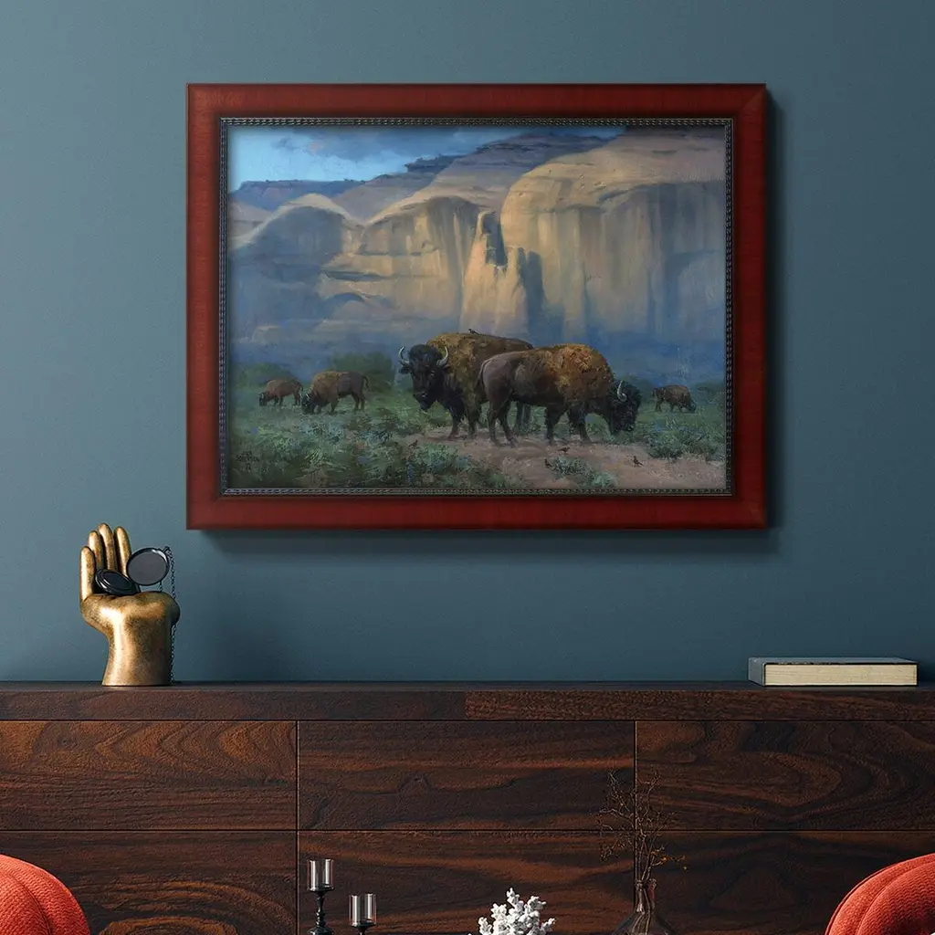 The Classic West Premium Framed Canvas- Ready to Hang A Premium Framed Canvas created to last. Framed in distressed wood and available in an array of sizes and colors Featuring a beveled a solid wood stretcher bar, each piece comes ready to hand 3 SIZES AVAILABLE 16''X20'' - Overall Size 18'X27'' - Overall Size 24''x36'' - Overall Size Each piece is made to order. Each piece comes with hanging hardware. Made in the USA Ready to Hang Giclee Paper Print Acrylic Glass Beveled Matt Board