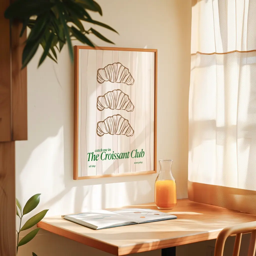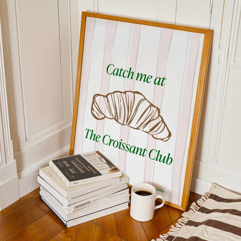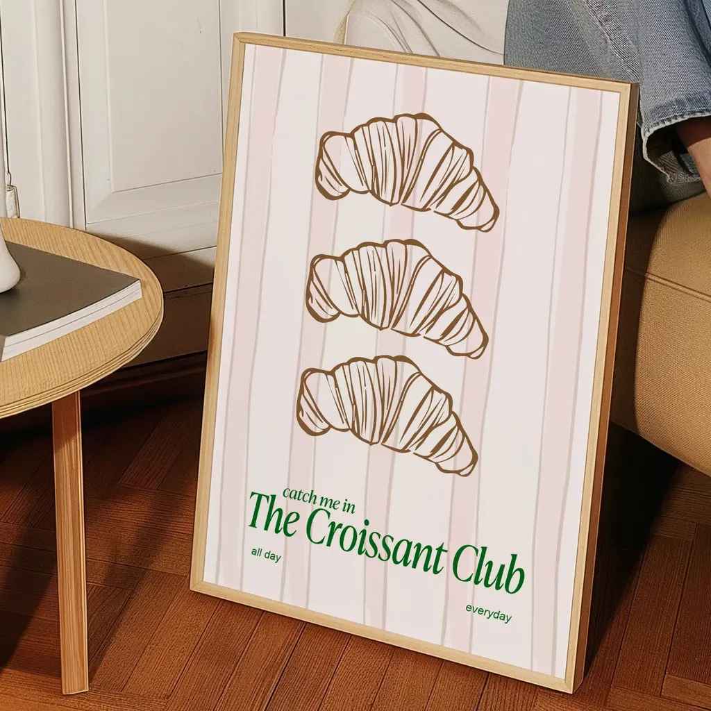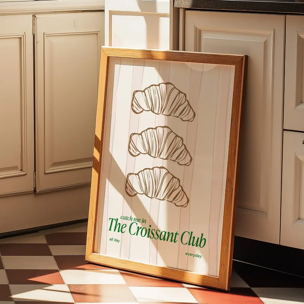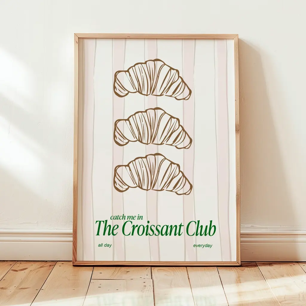 The Croissant ClubJoin the buttery, flaky, and oh-so-delicious club. This charming print celebrates everyone who knows that life is better with a croissant in hand. With fresh tones and a playful vibe, it’s the perfect addition to your kitchen, café corner, or breakfast nook.Sold without Frame.Giclée printed on Munken pure smooth cream paper which is certified by the Rainforest Alliance Program for FSC® Standards.