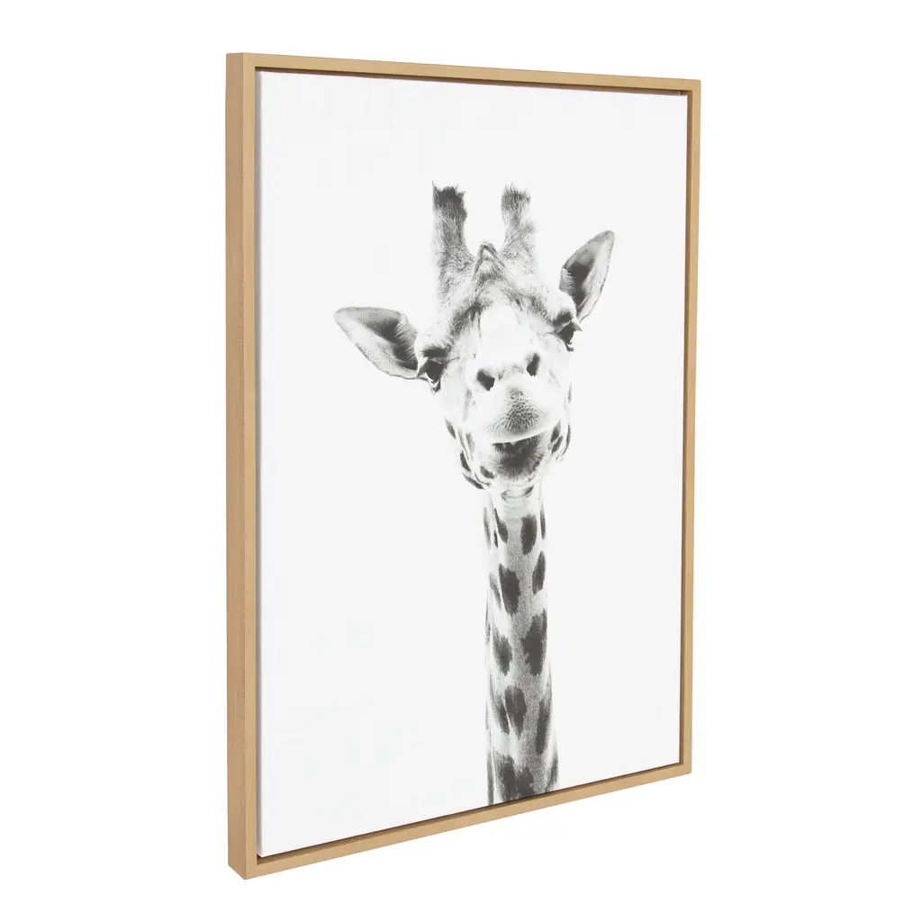 Celebrate the beauty and whimsy of one of Africa's most noble creatures. This giraffe portrait captures the gentle sweetness of the beautiful beast with serene wonder and captivating accuracy for a wonderful addition to any home.Features:Black and white giraffe portrait Printed on framed gallery wrapped canvasMetal sawtooth hangers come attached Inset MDF backLightweight materialLight natural wood-grain lookPrinted and framed33 inches high x 23 inches wide x 1.6 inches deep