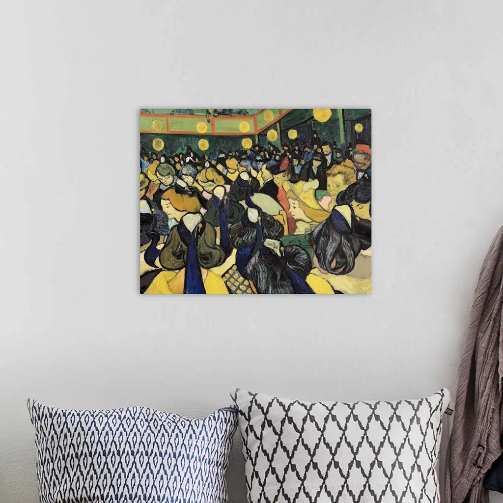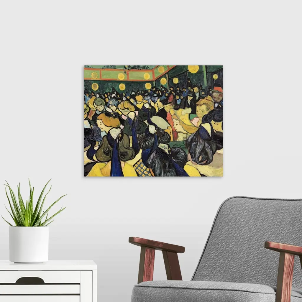 A classic artwork piece of an audience chatting inside a dance hall waiting for the show to begin.
