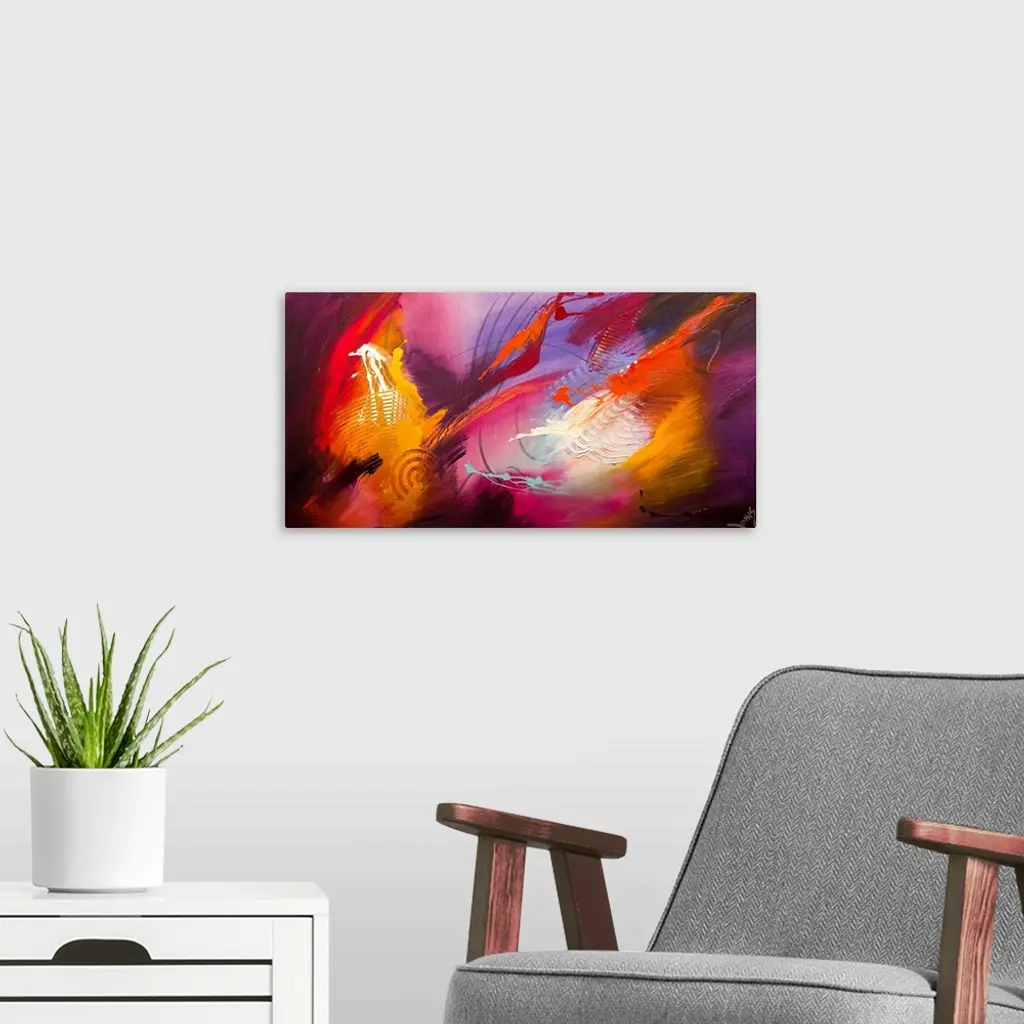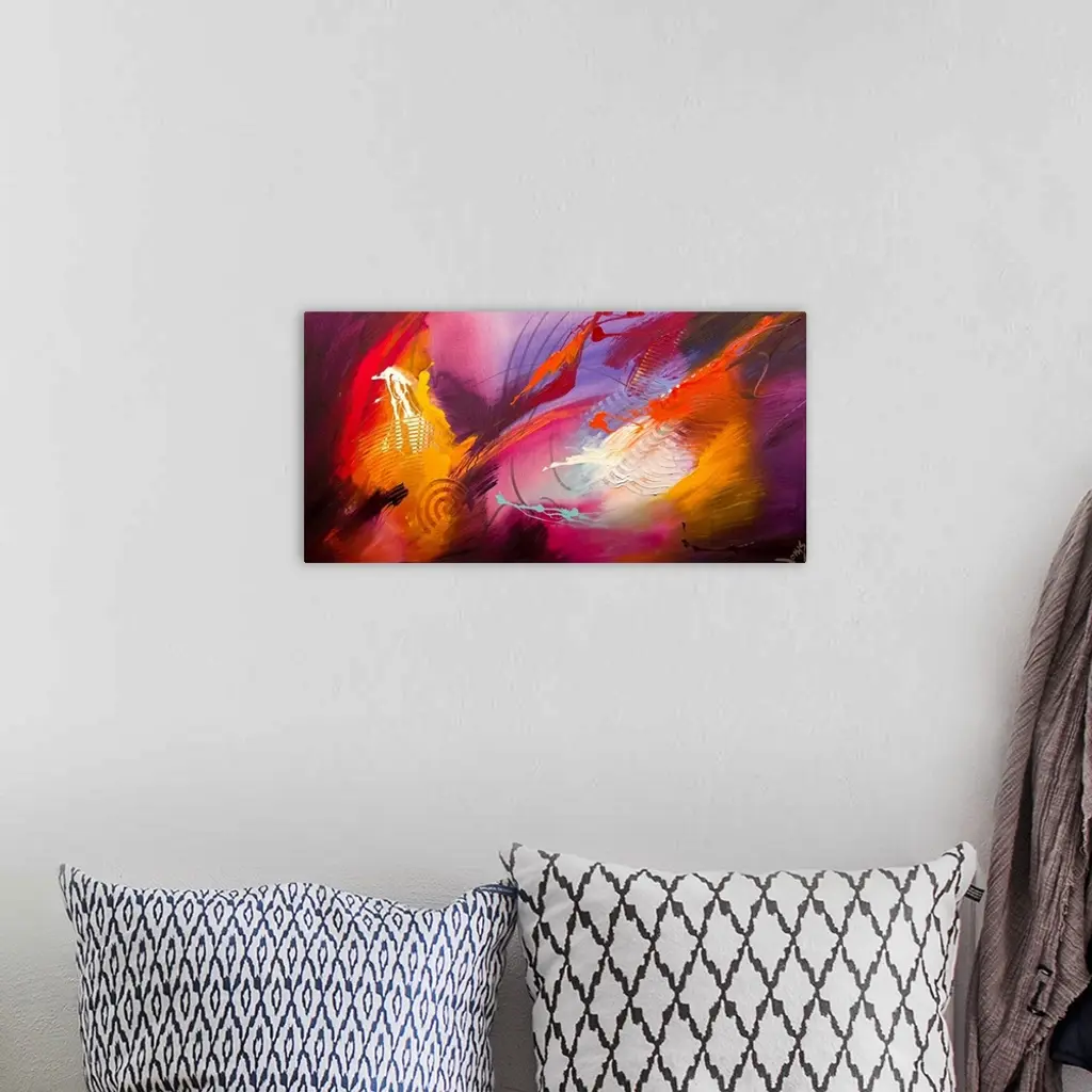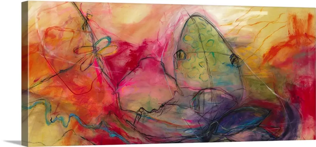 An abstract piece of artwork that uses various colors of paint in dance like motions.