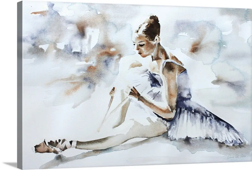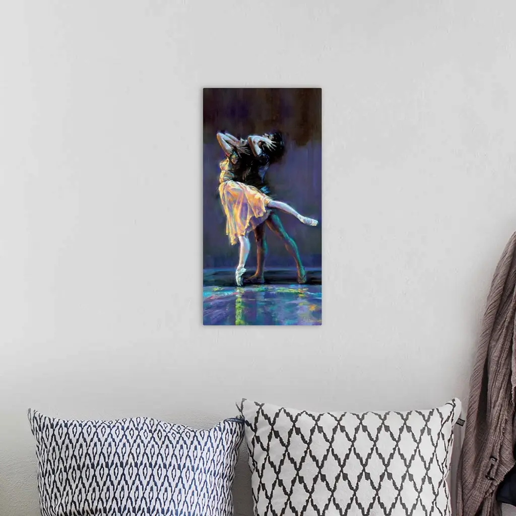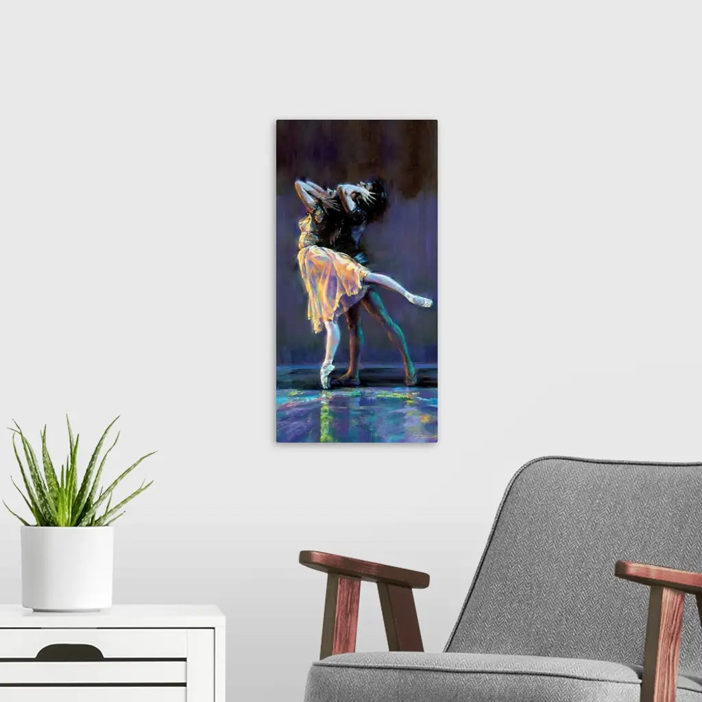 Contemporary painting of tow ballerinas preforming with a dark background and colorful, neon-like lights shining on them and the floor.