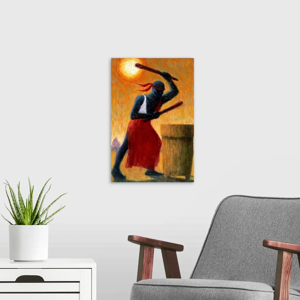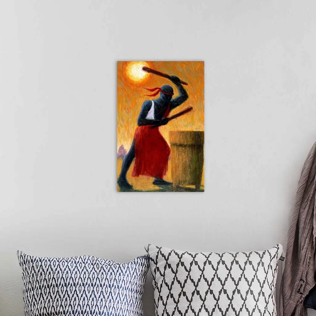 A vertical painting of a man beating on a drum outdoors with warm tones painted up and down.