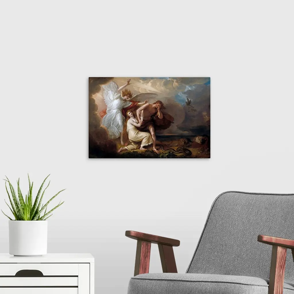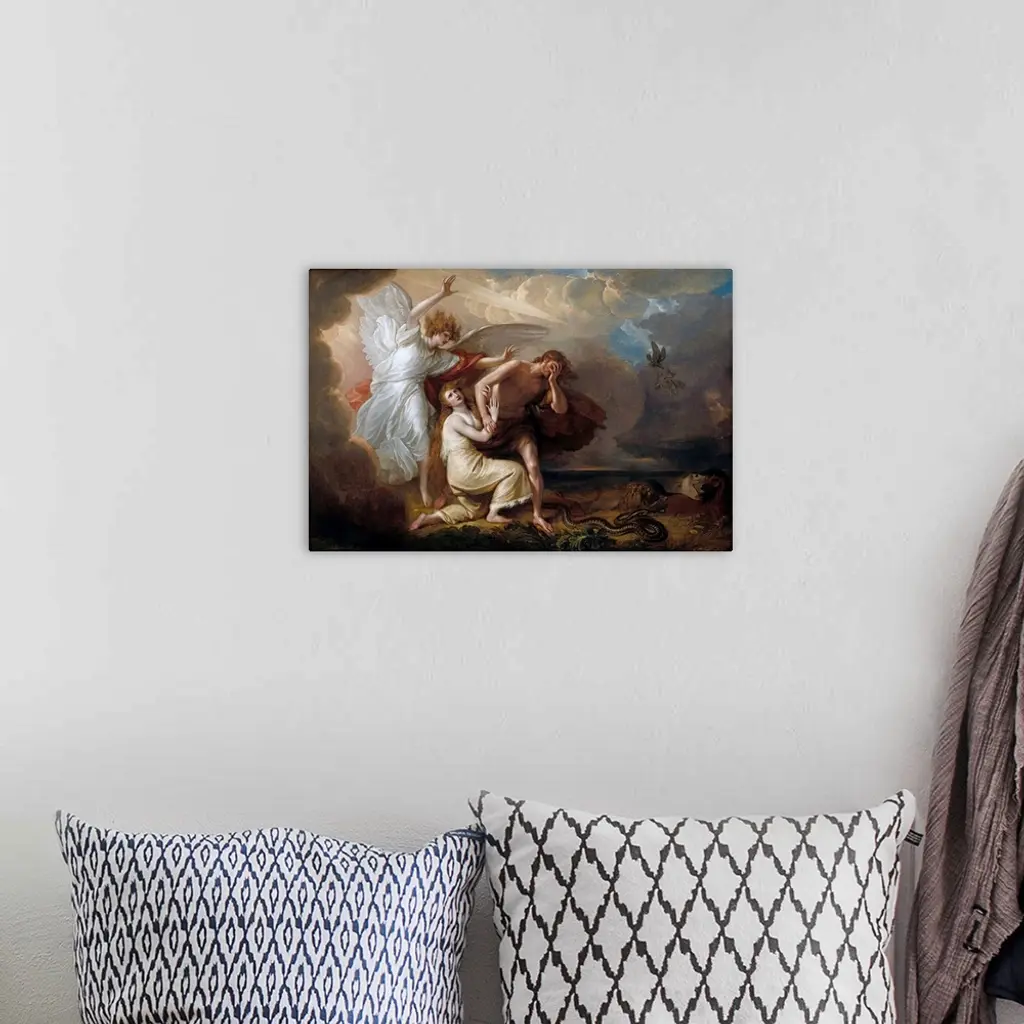The Expulsion of Adam and Eve from Paradise, 1791, by Benjamin West, by Anglo-American painting, oil on canvas. Archangel Michael expels Adam and Eve, who wear coats of skins' from Eden. The serpent, slithers away on its belly to eat dust. The sharp beam