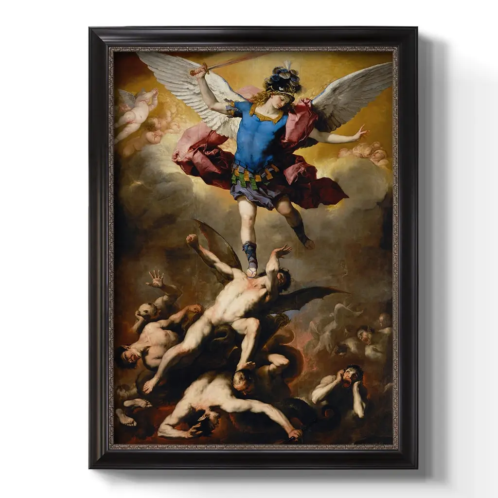 The Fall of the Rebel Angels Premium Framed Canvas- Ready to Hang A Premium Framed Canvas created to last. Framed in distressed wood and available in an array of sizes and colors Featuring a beveled a solid wood stretcher bar, each piece comes ready to hand 3 SIZES AVAILABLE 16''X20'' - Overall Size 18'X27'' - Overall Size 24''x36'' - Overall Size Each piece is made to order. Each piece comes with hanging hardware. Made in the USA Ready to Hang Giclee Paper Print Acrylic Glass Beveled Matt Board