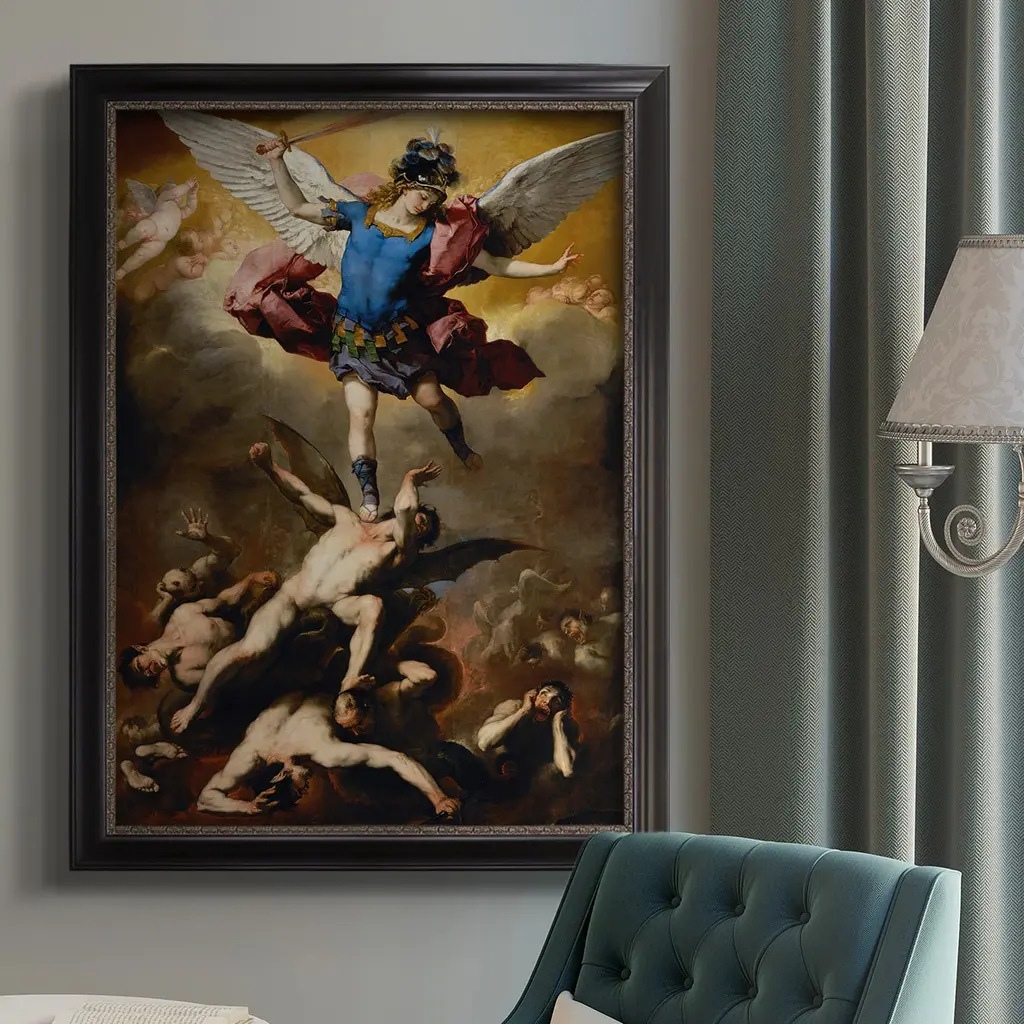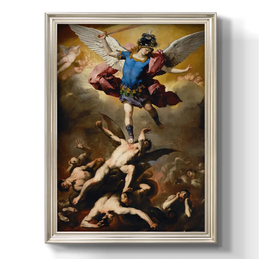 The Fall of the Rebel Angels Premium Framed Canvas- Ready to Hang A Premium Framed Canvas created to last. Framed in distressed wood and available in an array of sizes and colors Featuring a beveled a solid wood stretcher bar, each piece comes ready to hand 3 SIZES AVAILABLE 16''X20'' - Overall Size 18'X27'' - Overall Size 24''x36'' - Overall Size Each piece is made to order. Each piece comes with hanging hardware. Made in the USA Ready to Hang Giclee Paper Print Acrylic Glass Beveled Matt Board