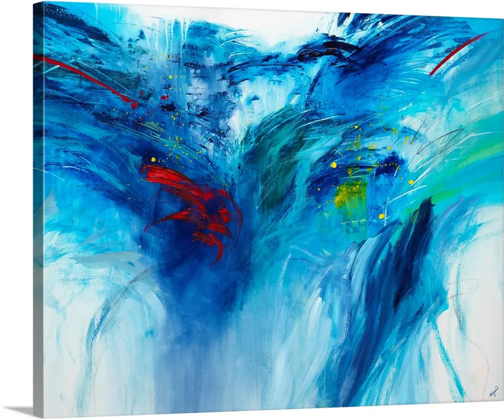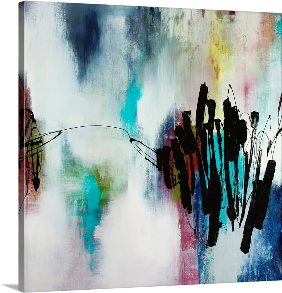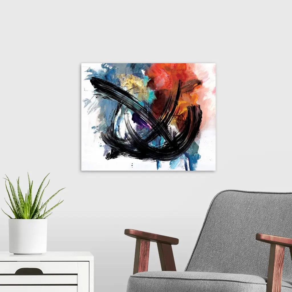 Contemporary abstract artwork in bright, fiery colors with broad black strokes across the center.
