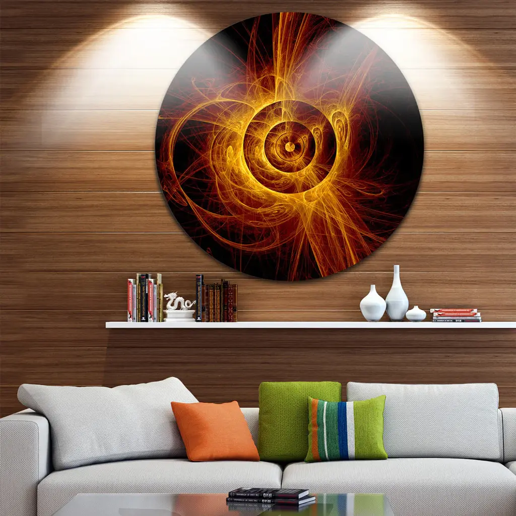 Bring Contemporary Abstraction to your home with this large Circle Metal wall art. This The Flashing Yellow Flame Metal Artwork makes it the focal point of any room or office. - White Gloss Coating ensures colors are extra vibrant with light reflection.- Aluminum grade Sheet Metal with 1 inch mounting frame on the back giving the illusion that the artwork is floating on the wall..- Mounting Brackets are included along with instructions.- High Quality Digital images are created directly into a glossy aluminum panel producing a stunning and captivating print into the glossy finish of the metal.- Water, Fire and Scratch resistant HD Aluminum panels.- Looks better than any photo paper and guaranteed to last at least 20 years- Easy to clean with a microfiber cloth. Colors are far superior to regular Canvas Art. - Easy to Hang