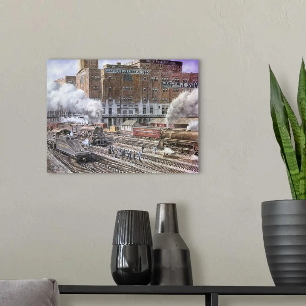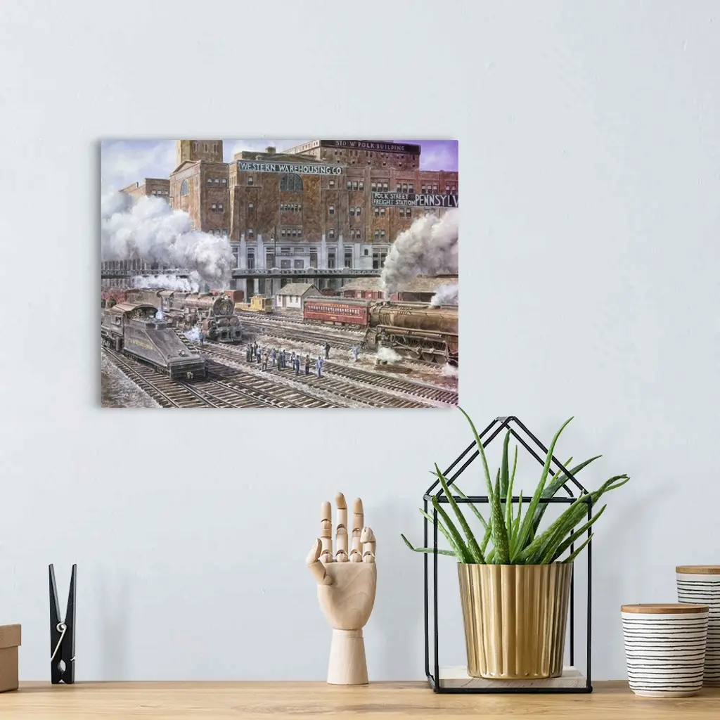 Contemporary painting of a rail yard, with large clouds of smoke billowing from the train stacks.