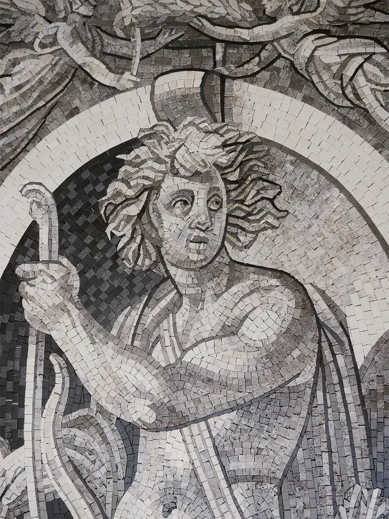 Introducing "The God Sol Mosaic Artwork," a breathtaking representation of the embodiment of the Sun revered in ancient Roman mythology. This exquisite piece captures the essence of Sol, the sun god, celebrated at the arrival of warmer days after the cold seasons have passed. Crafted with meticulous attention to detail, The God Sol Mosaic Artwork is handmade from natural mosaic stones, ensuring that each piece is unique and imbued with the beauty of nature. The vibrant colors and intricate patterns come together to create a stunning visual that ignites warmth and joy, making it an ideal decoration for your home or garden.Durability is key, and this artwork is designed to withstand the elements. It is highly durable and waterproof, making it perfect for both indoor and outdoor walls. Whether you choose to adorn your living space, brighten up your patio, or add a touch of elegance to your garden, The God Sol Mosaic Artwork will serve as a focal point that sparks conversations and admiration.Give your space a touch of history and elegance with this timeless mural. Invite the spirit of Sol into your life and celebrate the sun's vibrant energy every day. Perfect as a gift for nature lovers, art enthusiasts, or anyone who appreciates the beauty of craftsmanship, The God Sol Mosaic Artwork is not just decor; it’s a symbol of warmth, life, and the joyous return of sunny days. Transform your walls and embrace the beauty of the sun with this magnificent mosaic today.