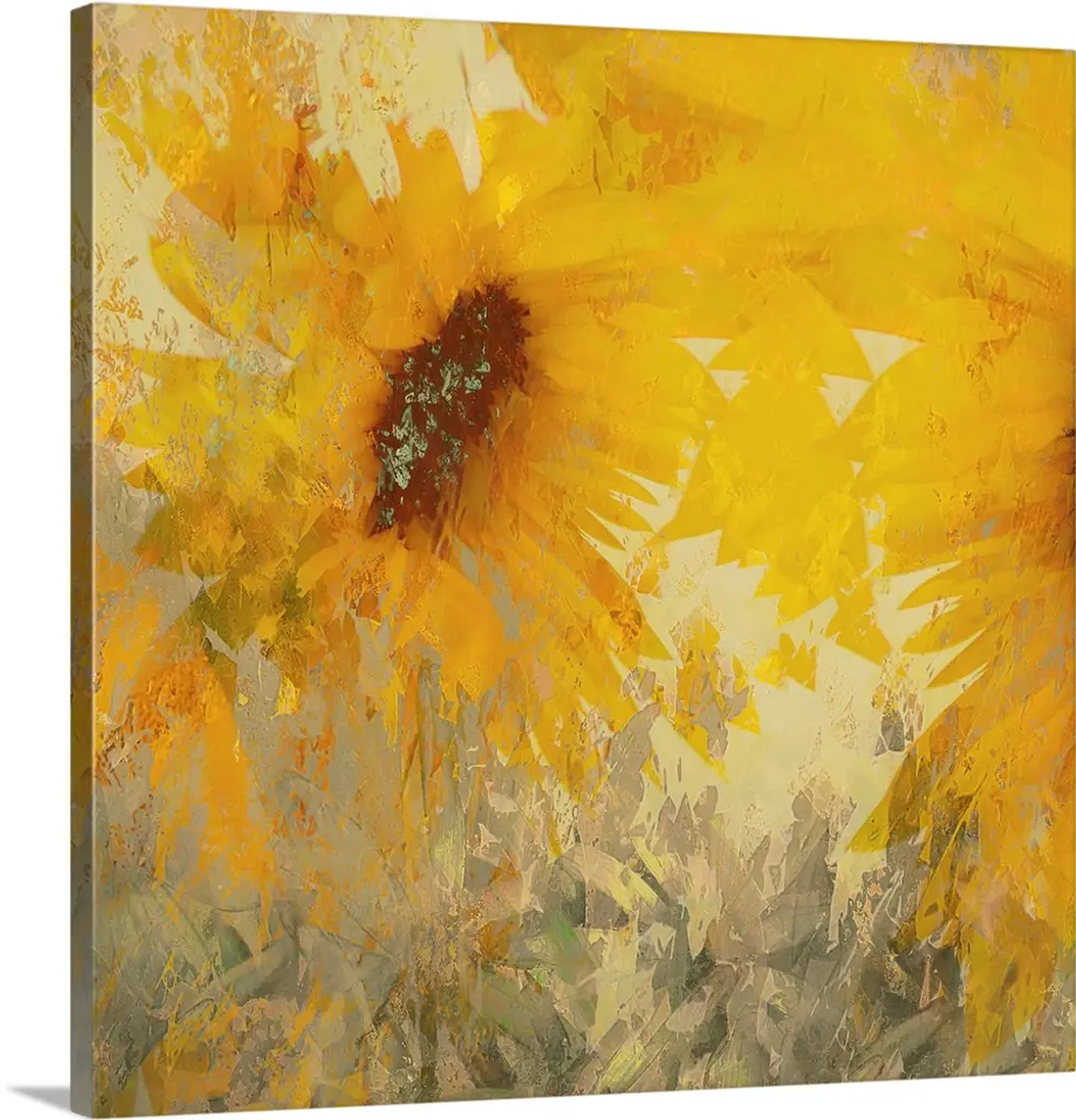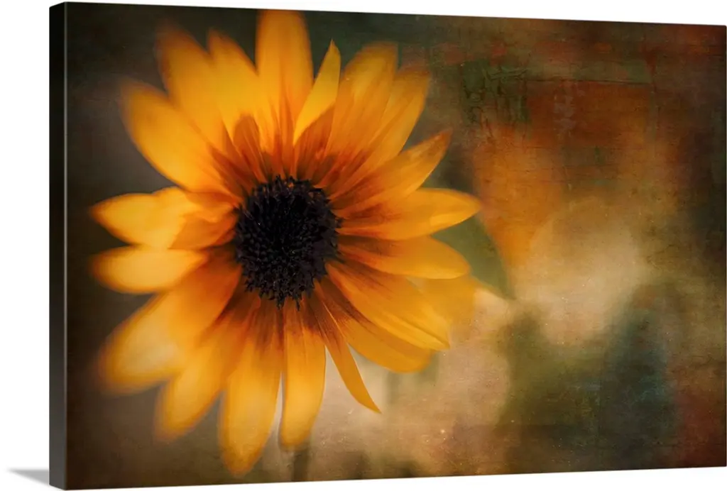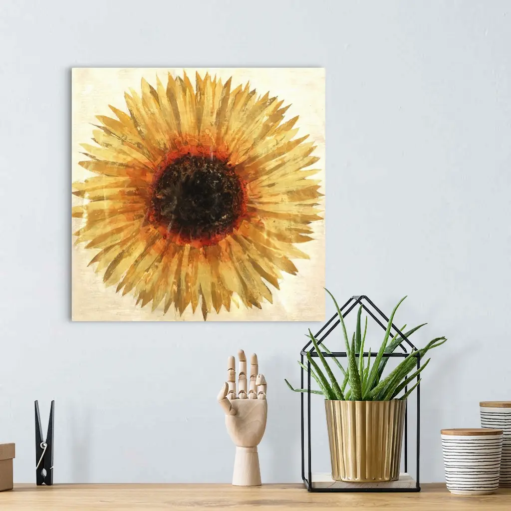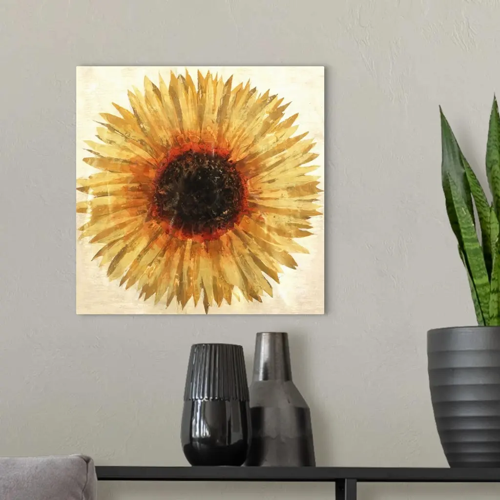 Contemporary painting of a big beautiful sunflower against a brown background.