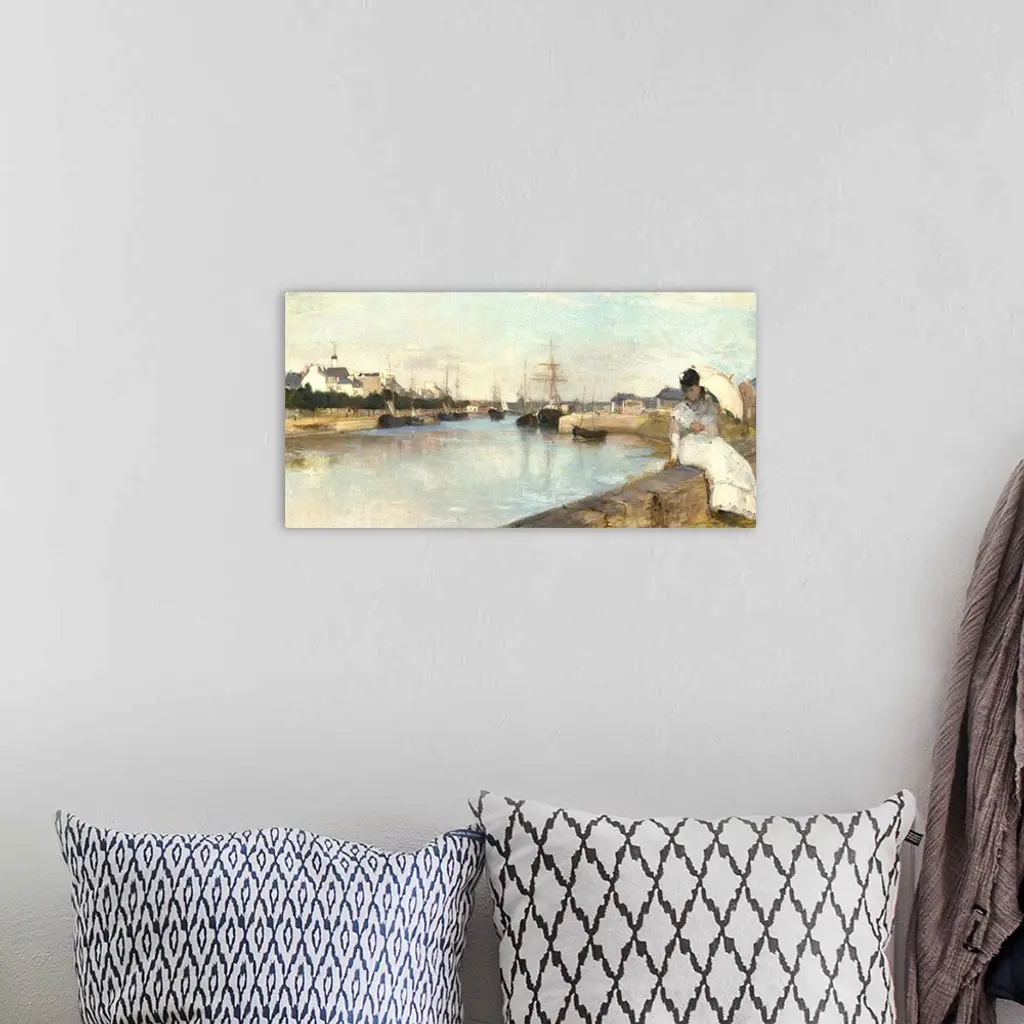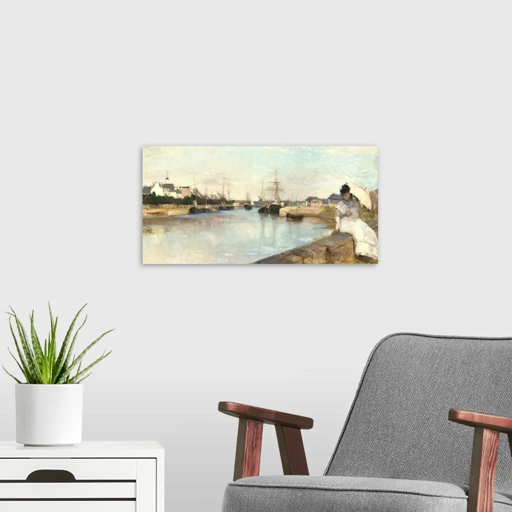 The Harbor at Lorient, by Berthe Morisot, 1869, French painting, oil on canvas. Impressionist view of still water and ships in the Breton harbor, with a women in white seated on the seawall