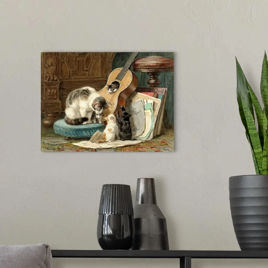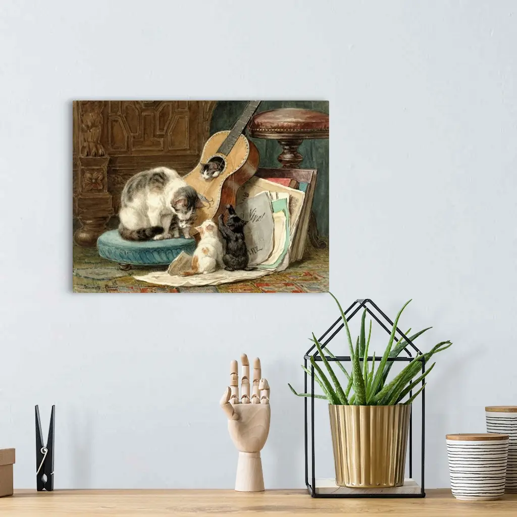The Harmonists, by Henriette Ronner, 1876-77, Dutch watercolor painting, on paper. A mother cat sits on a footstool near her four kittens who with its broken strings. One kitten sits inside the instrument.
