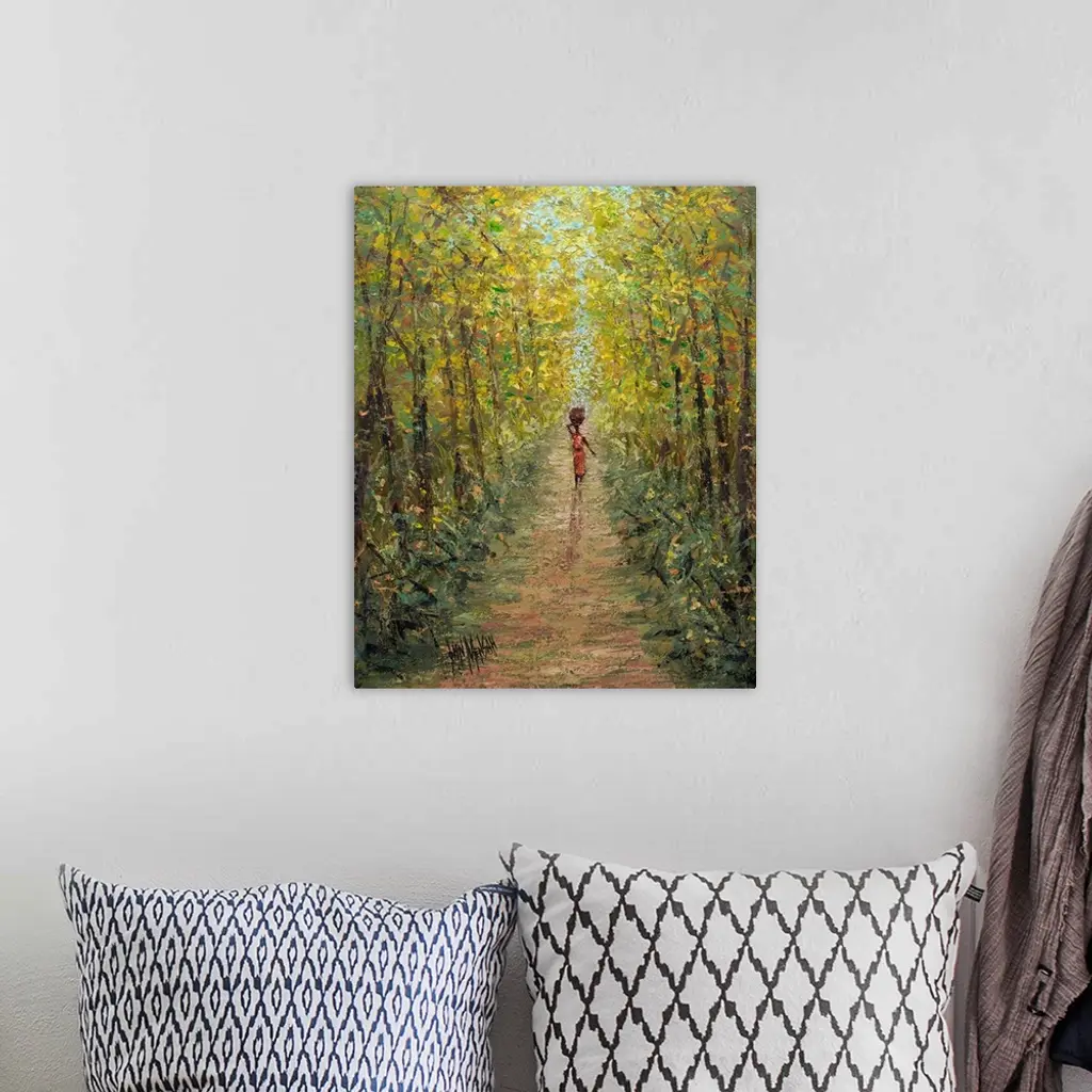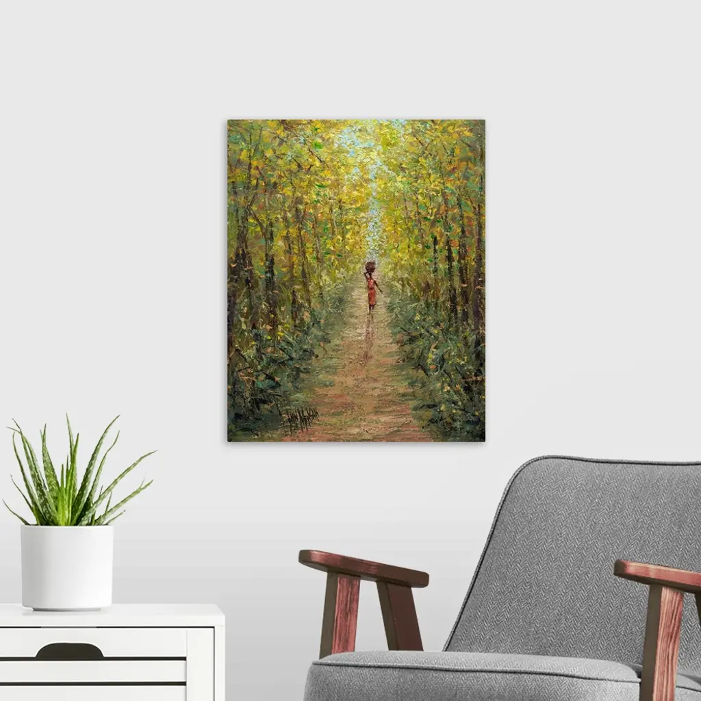 A woman, already being a wife and homemaker, goes beyond these roles to make ends meet, observes John Atta Mensah. Painting with acrylics, he invites the presence of a woman walking on a path among tall trees. On her head she carries a cane basket filled with the fruits of the harvest.