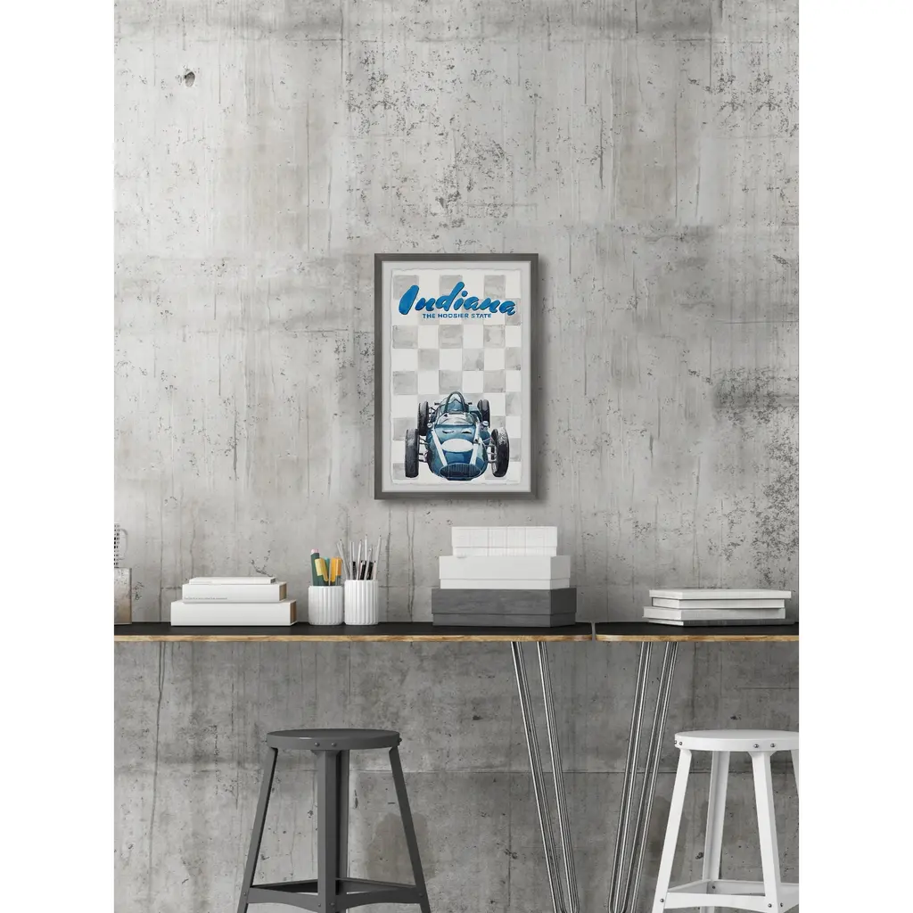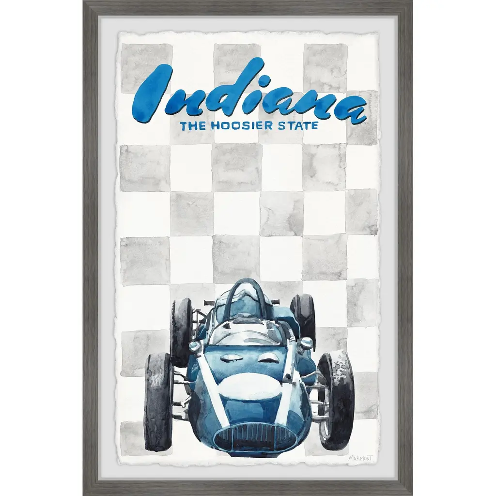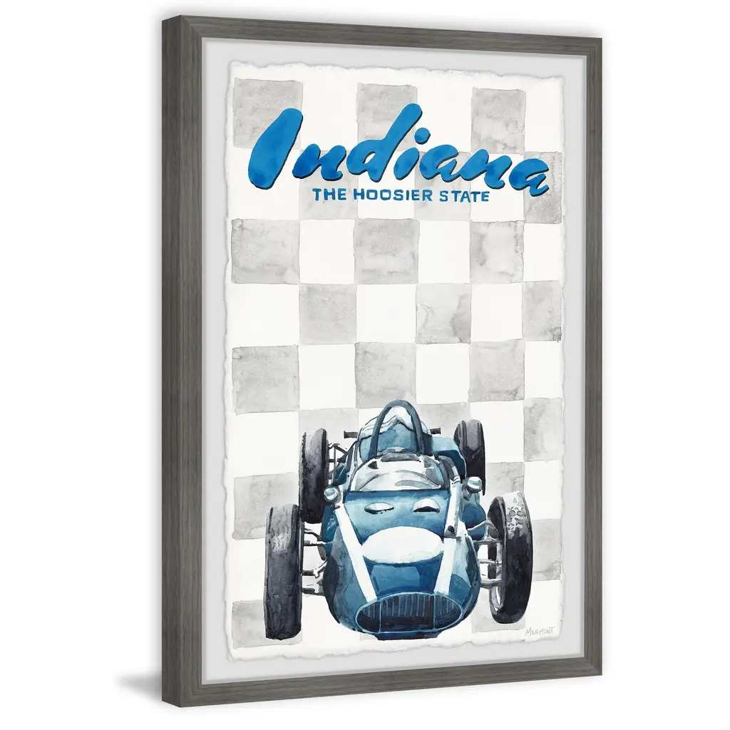 Put your love for The Hoosier State on display with this grey and blue print of Indiana and its famous racing vehicle. Proudly printed in the USA, this piece is printed on high quality archive paper and professionally hand-framed. With wall-mounting hooks included, this artful accent is ready to hang up as soon as it reaches your front door. • Top quality Giclee print on high resolution Archive Paper • Hand cut deckled edges • High quality durable non-warping frame • Finished under shatter resistant plexiglass • Arrives ready to hang • Includes a certificate of authenticity • Printed in the USA