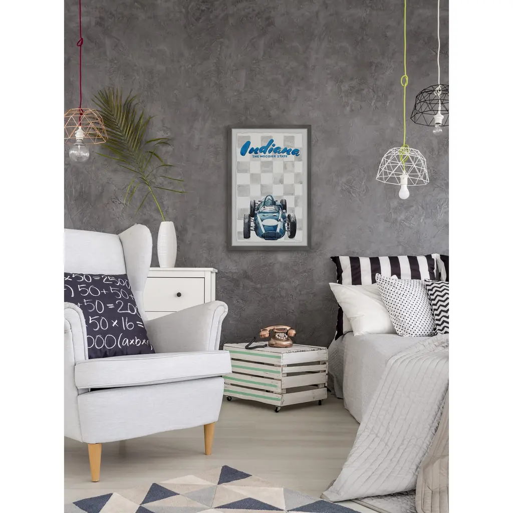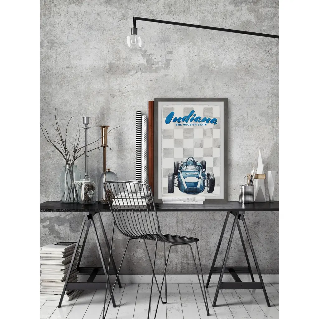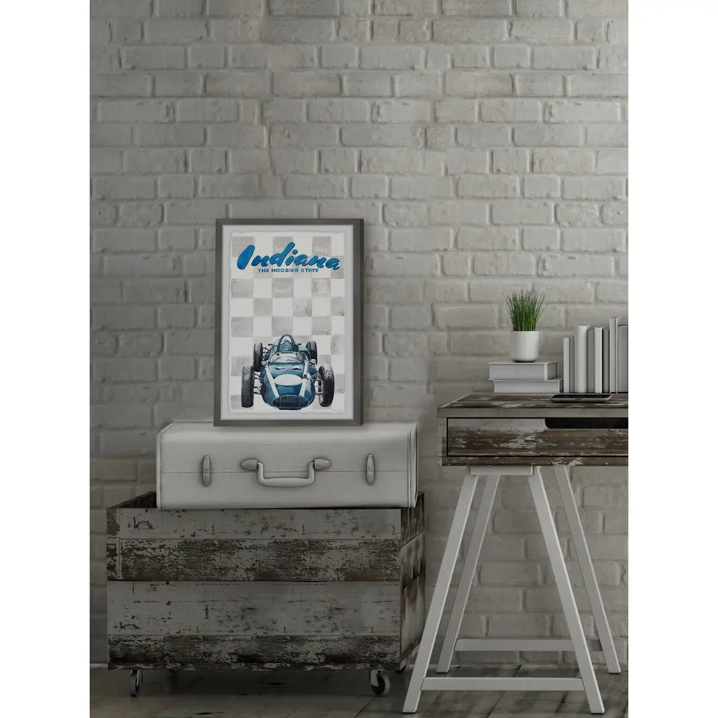 Put your love for The Hoosier State on display with this grey and blue print of Indiana and its famous racing vehicle. Proudly printed in the USA, this piece is printed on high quality archive paper and professionally hand-framed. With wall-mounting hooks included, this artful accent is ready to hang up as soon as it reaches your front door. • Top quality Giclee print on high resolution Archive Paper • Hand cut deckled edges • High quality durable non-warping frame • Finished under shatter resistant plexiglass • Arrives ready to hang • Includes a certificate of authenticity • Printed in the USA