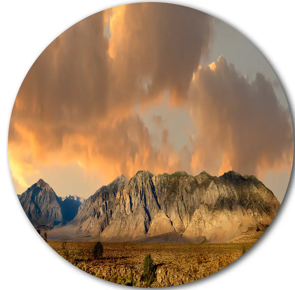 Bring Contemporary Abstraction to your home with this large Circle Metal wall art. This The Horton Plains Metal Artwork makes it the focal point of any room or office. - White Gloss Coating ensures colors are extra vibrant with light reflection.- Aluminum grade Sheet Metal with 1 inch mounting frame on the back giving the illusion that the artwork is floating on the wall..- Mounting Brackets are included along with instructions.- High Quality Digital images are created directly into a glossy aluminum panel producing a stunning and captivating print into the glossy finish of the metal.- Water, Fire and Scratch resistant HD Aluminum panels.- Looks better than any photo paper and guaranteed to last at least 20 years- Easy to clean with a microfiber cloth. Colors are far superior to regular Canvas Art. - Easy to Hang