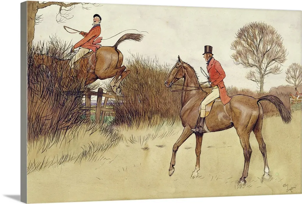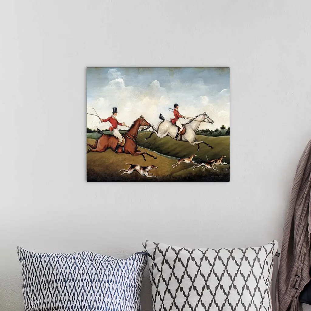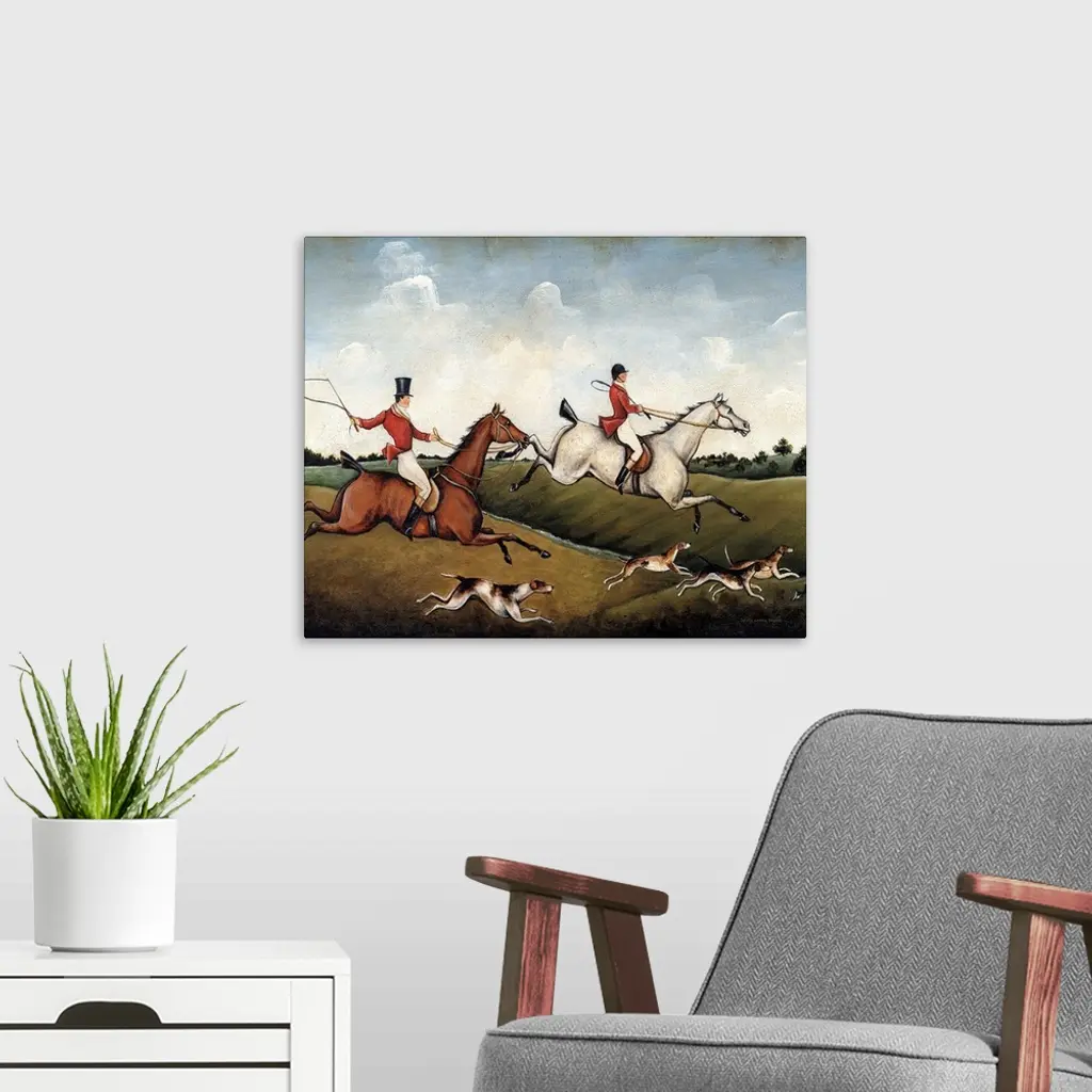 A contemporary painting of an English fox hunt with a distressed appearance.