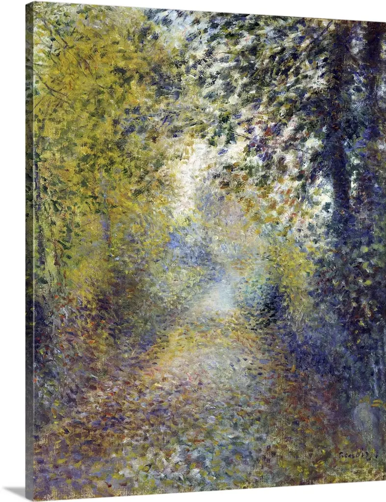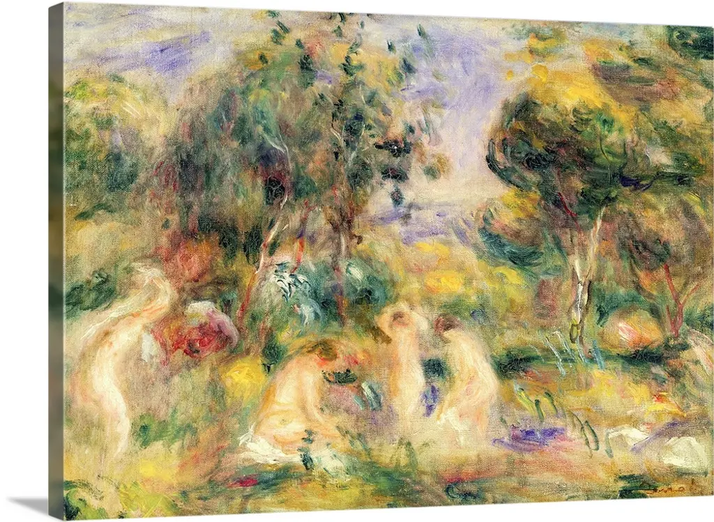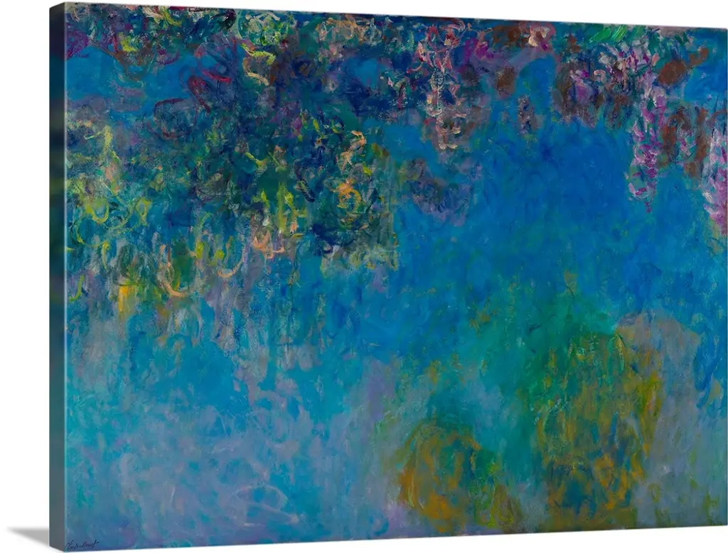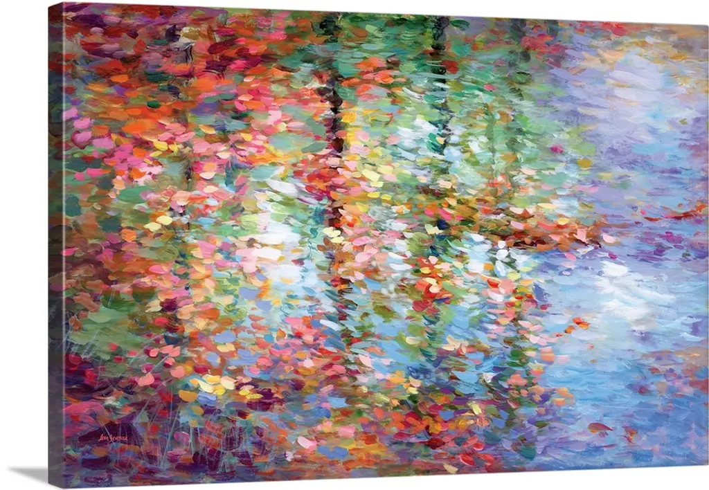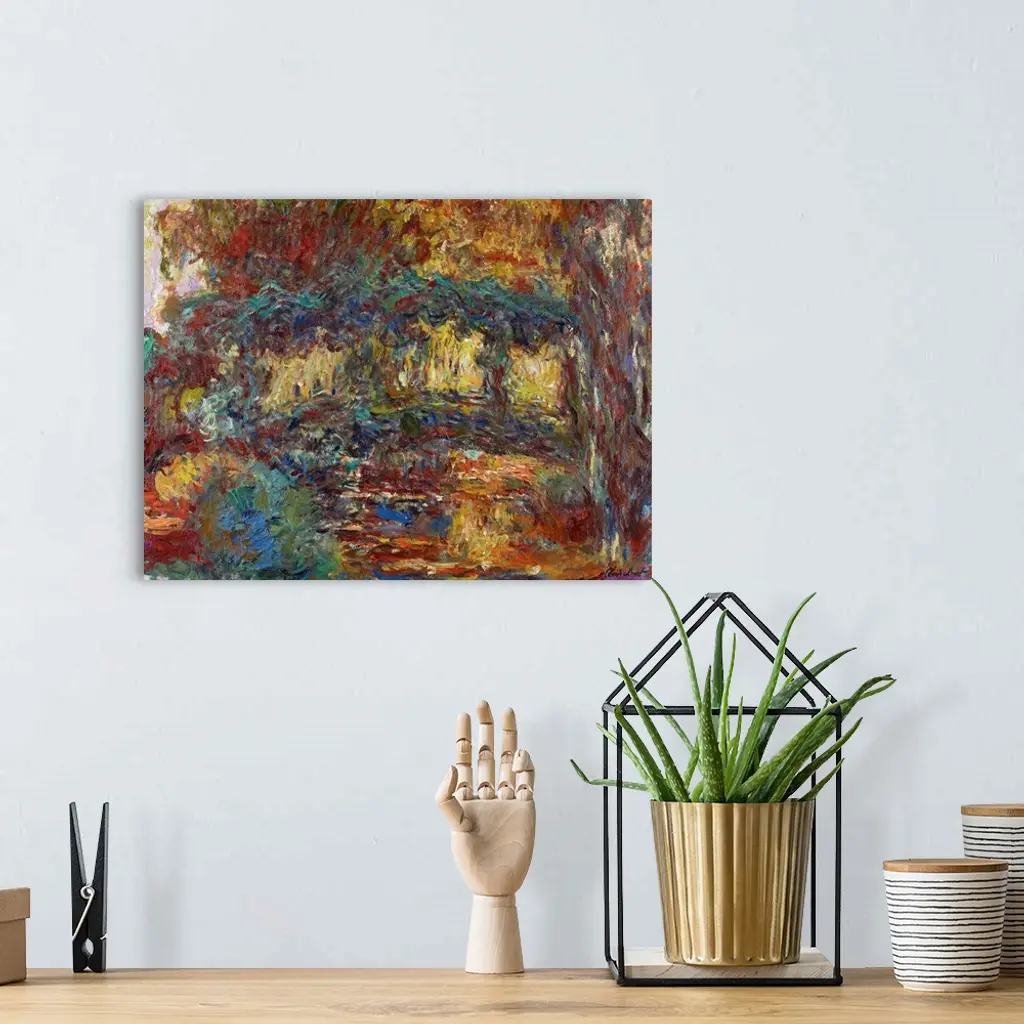 Horizontal classic painting on a giant wall hanging of a small bridge over water, surrounded by a natural landscape in Japan. Painted with very small, swirling brushstrokes resulting in minimal detail and a nearly abstract image.