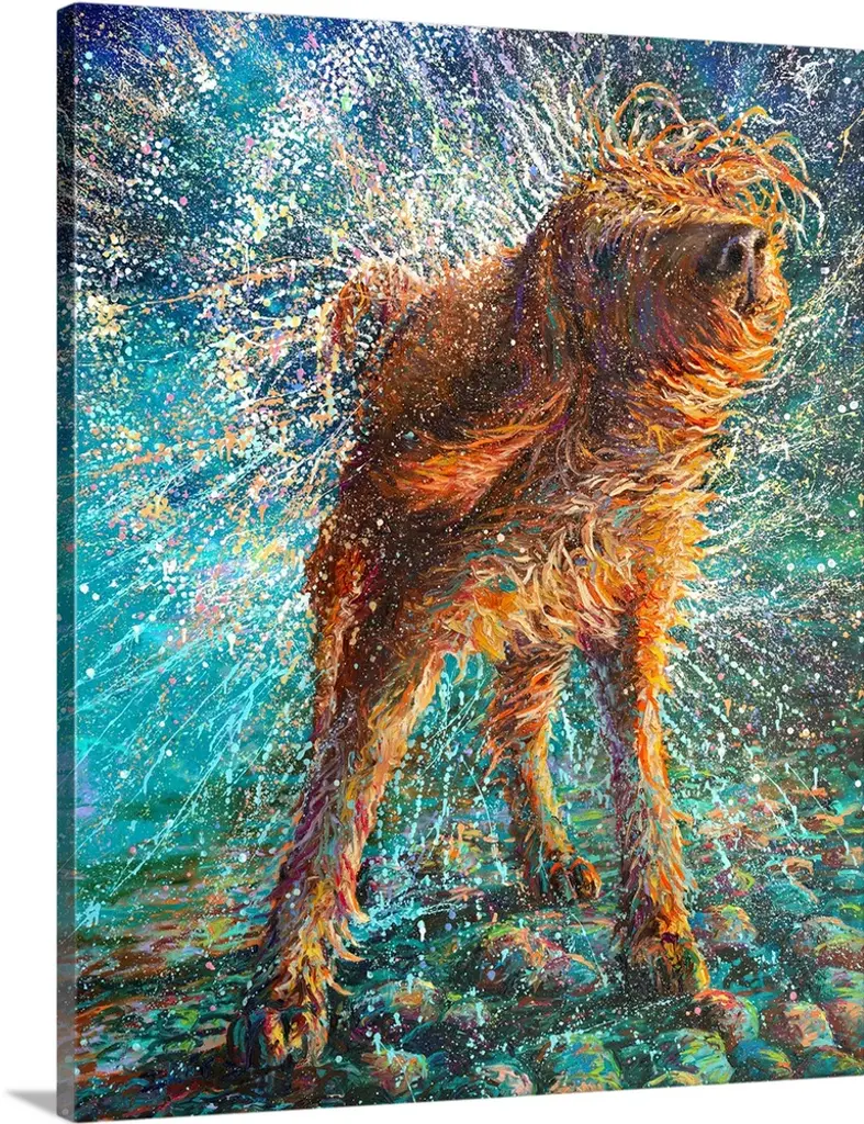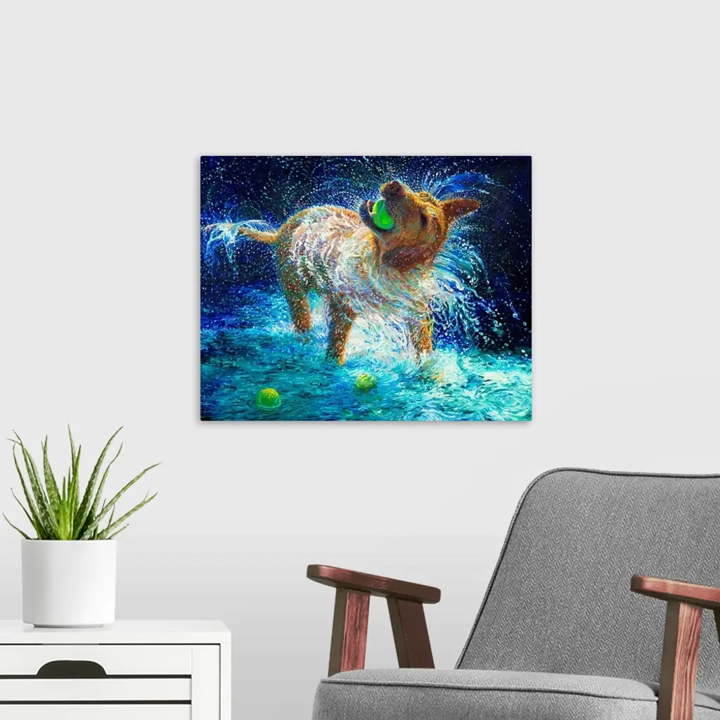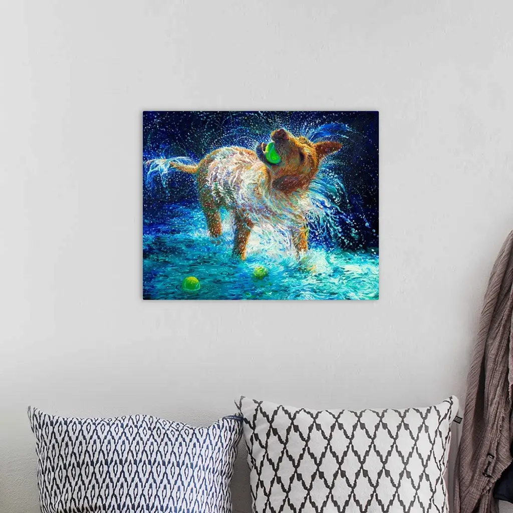 Brightly colored contemporary artwork of a dog with three tennis balls.