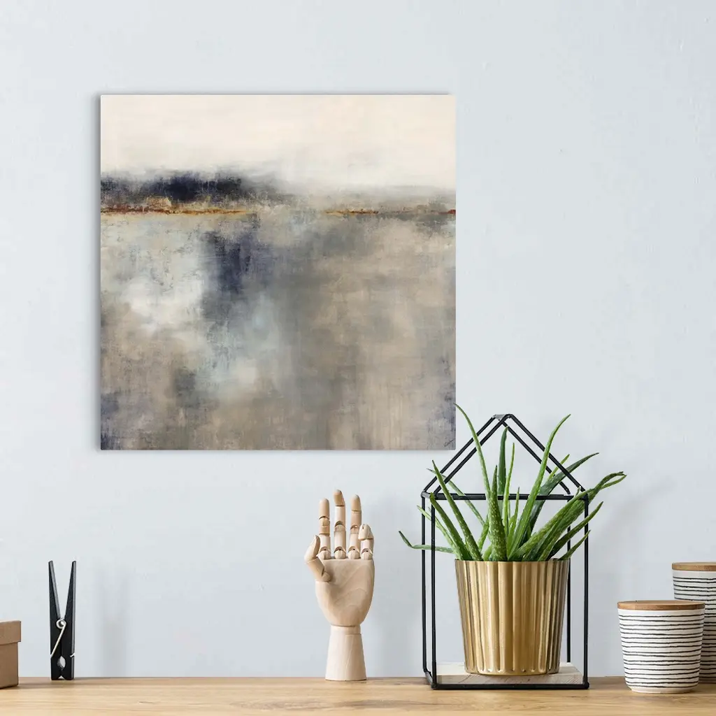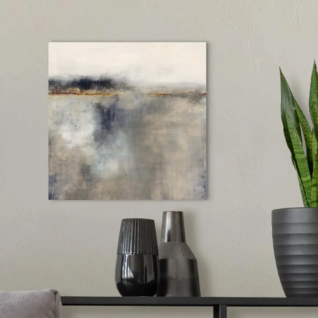 Contemporary abstract painting in muted grey and brown tones, resembling a horizon.
