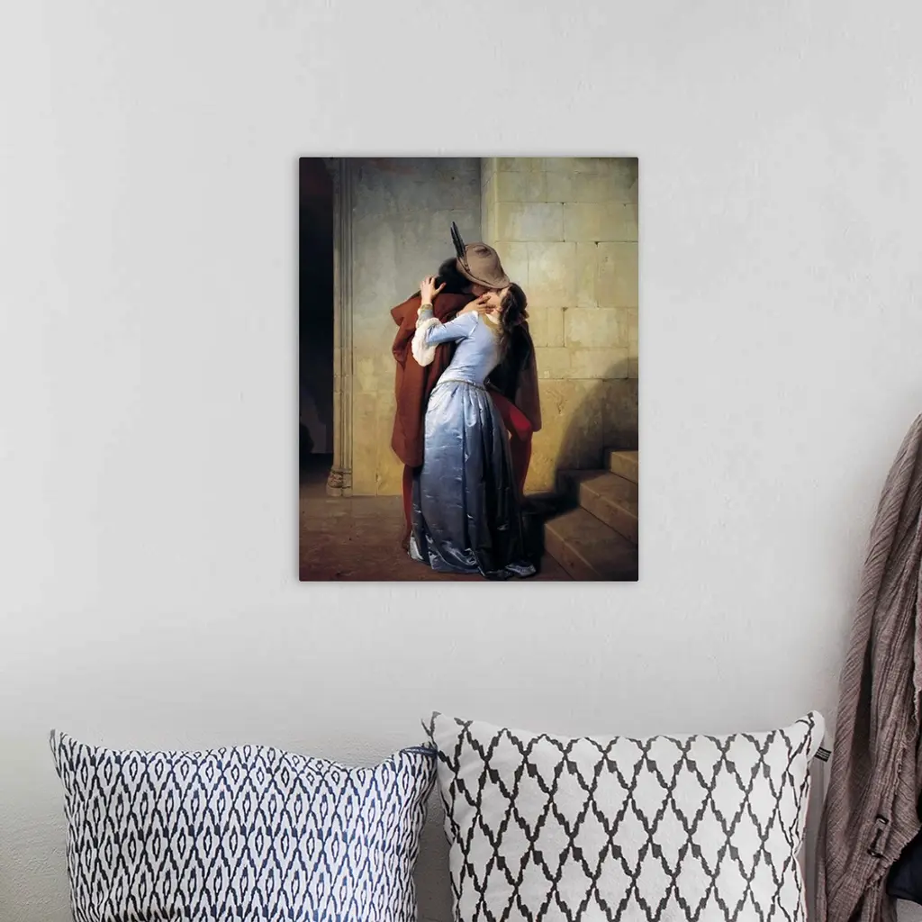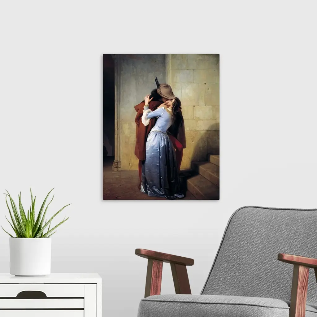 19th century classic painting of a man kissing a woman in a stone hallway.