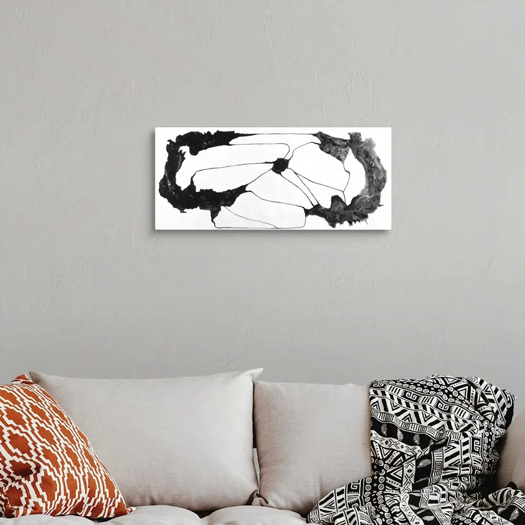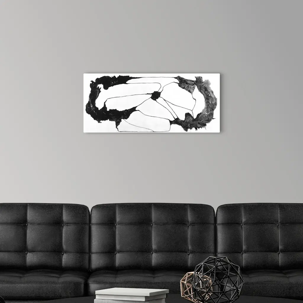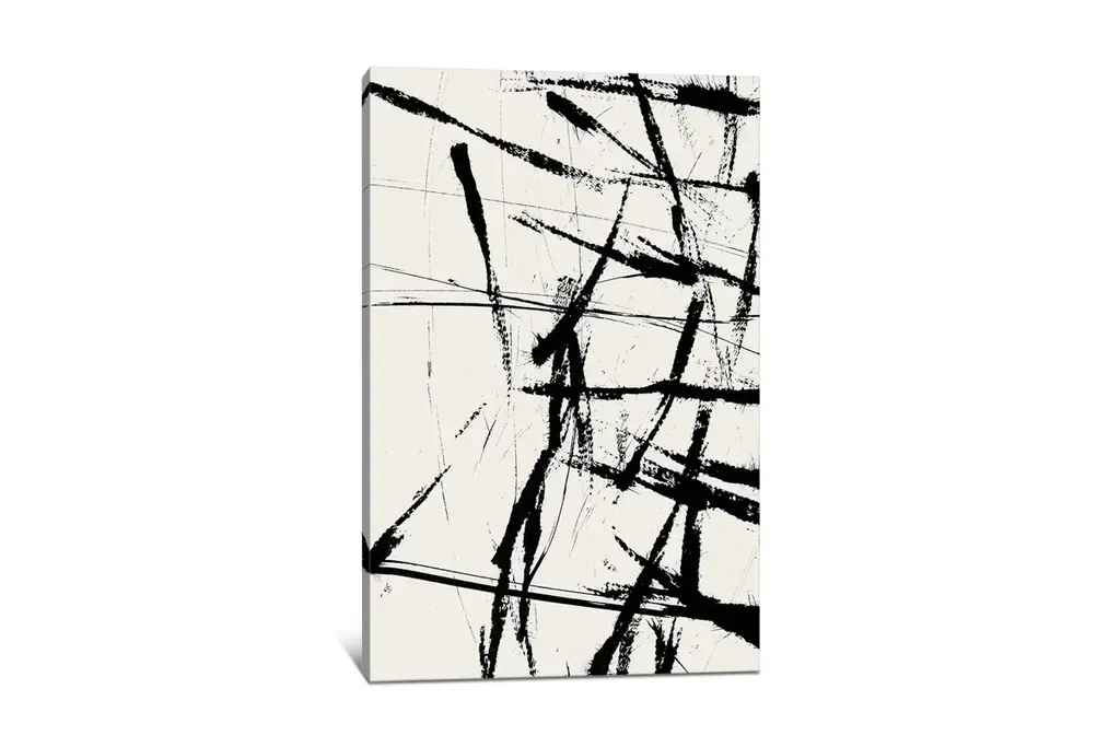 Contemporary abstract painting using dark bold lines against a neutral toned background.