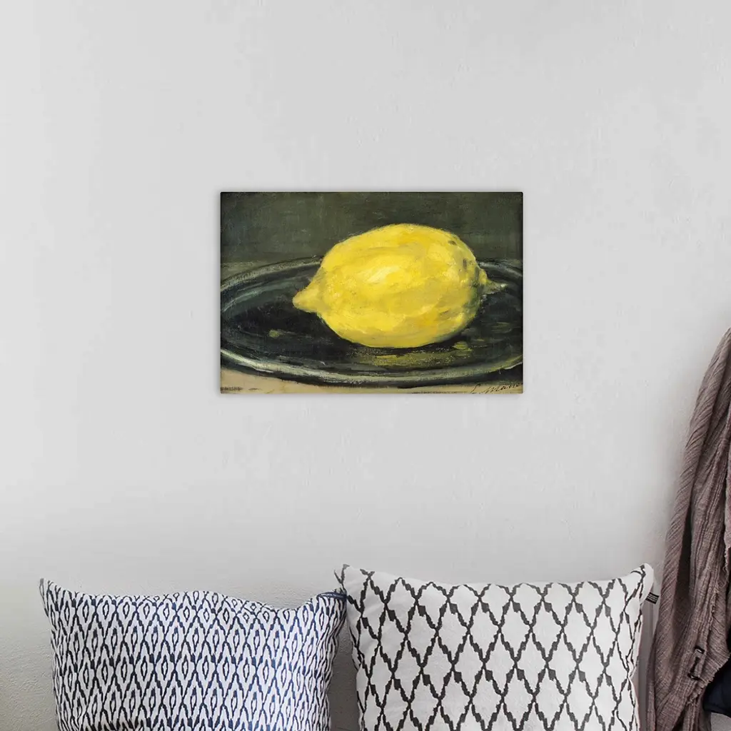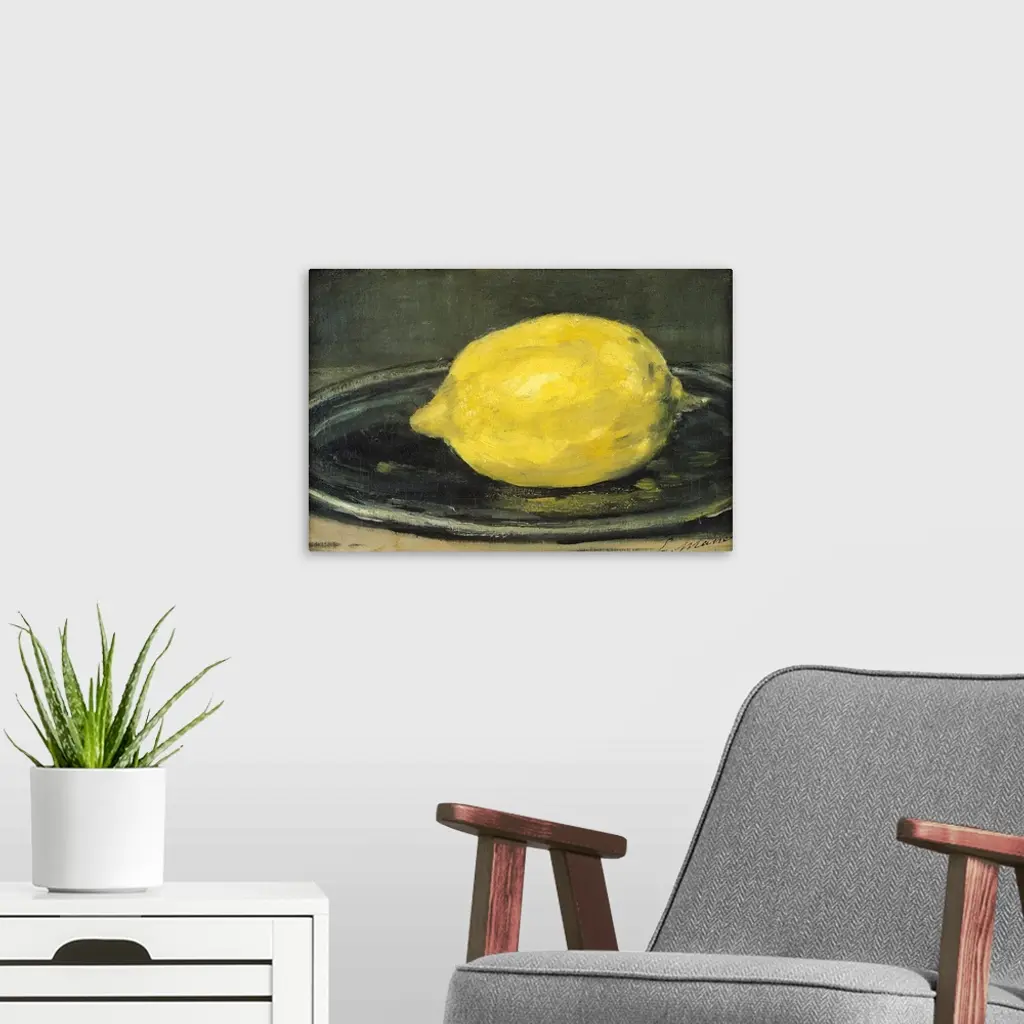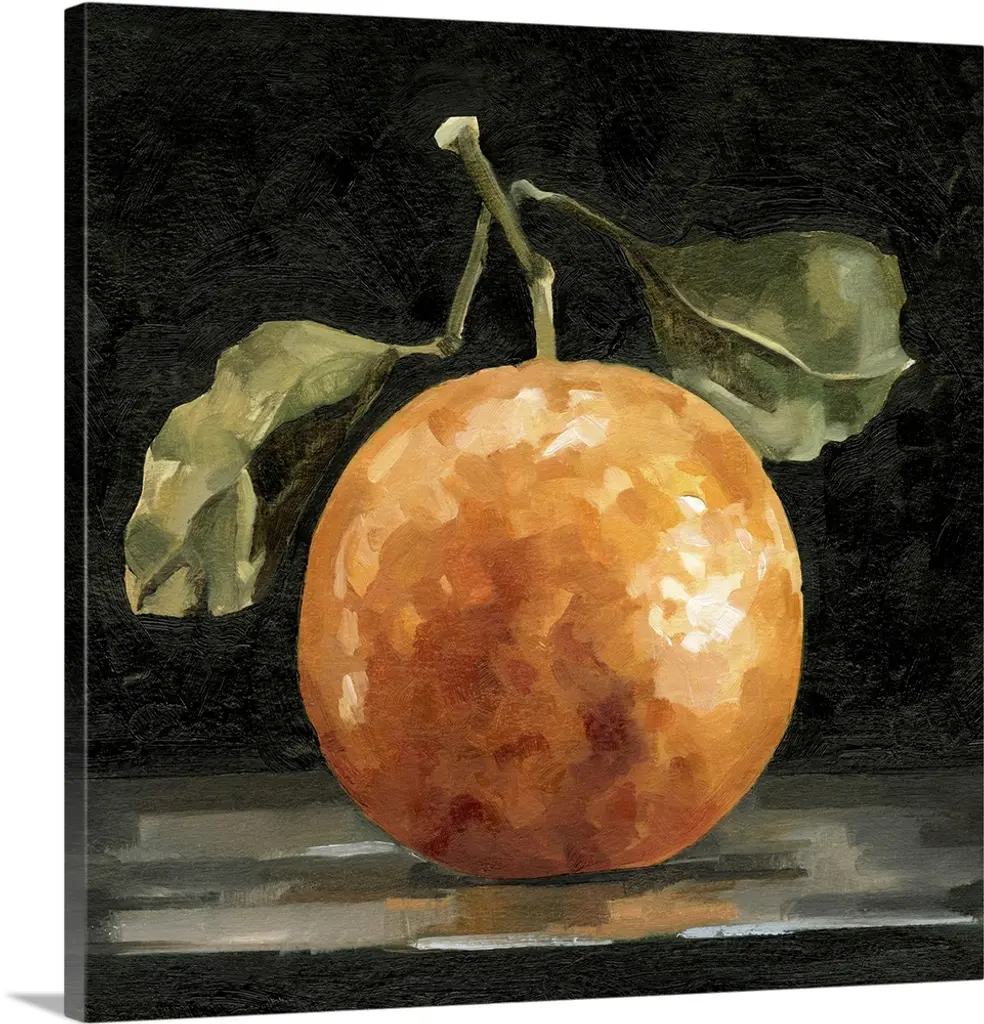 This horizontal art work is a close up painting of a citrus fruit on a plate created by a 19th century Impressionist master.