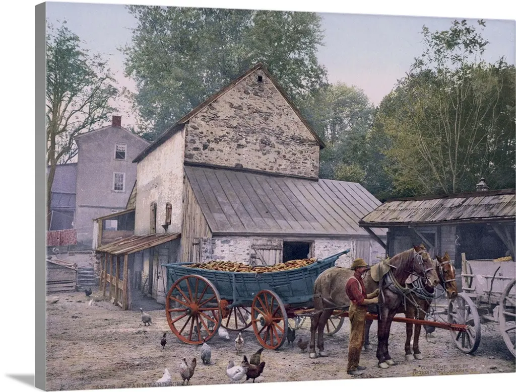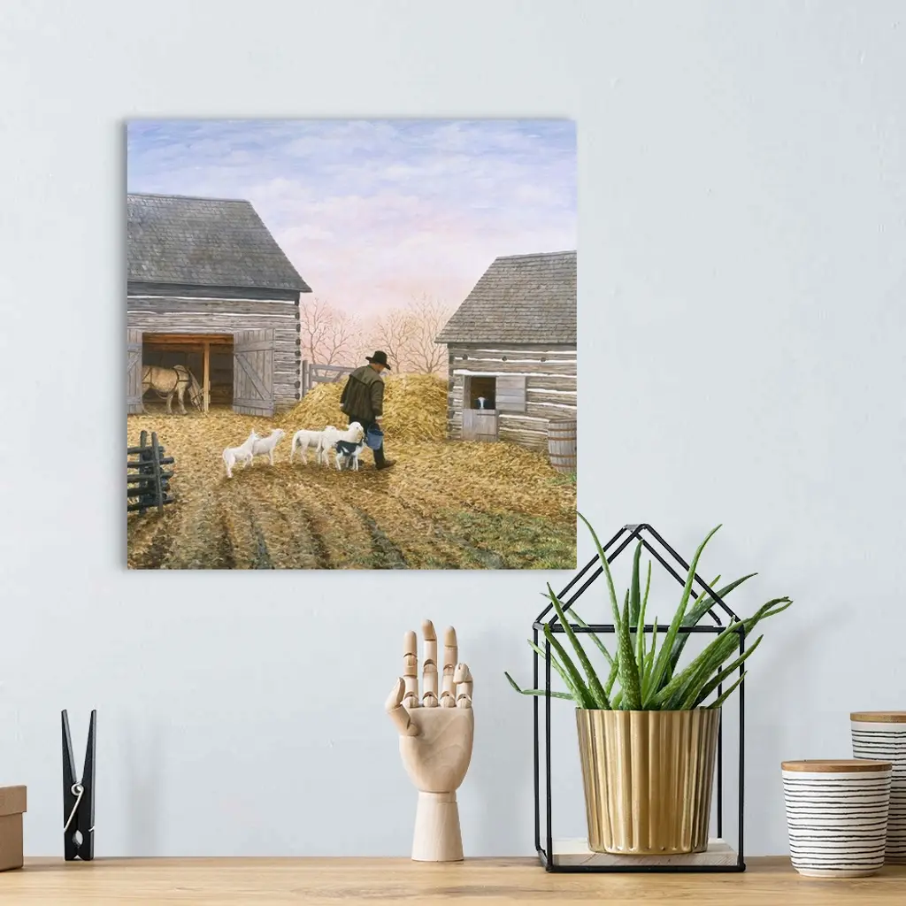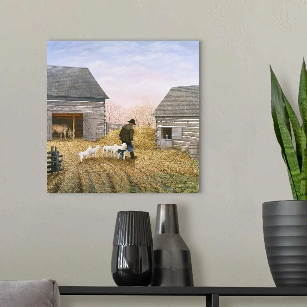 Contemporary artwork of a farmer with his sheep between two farm buildings.