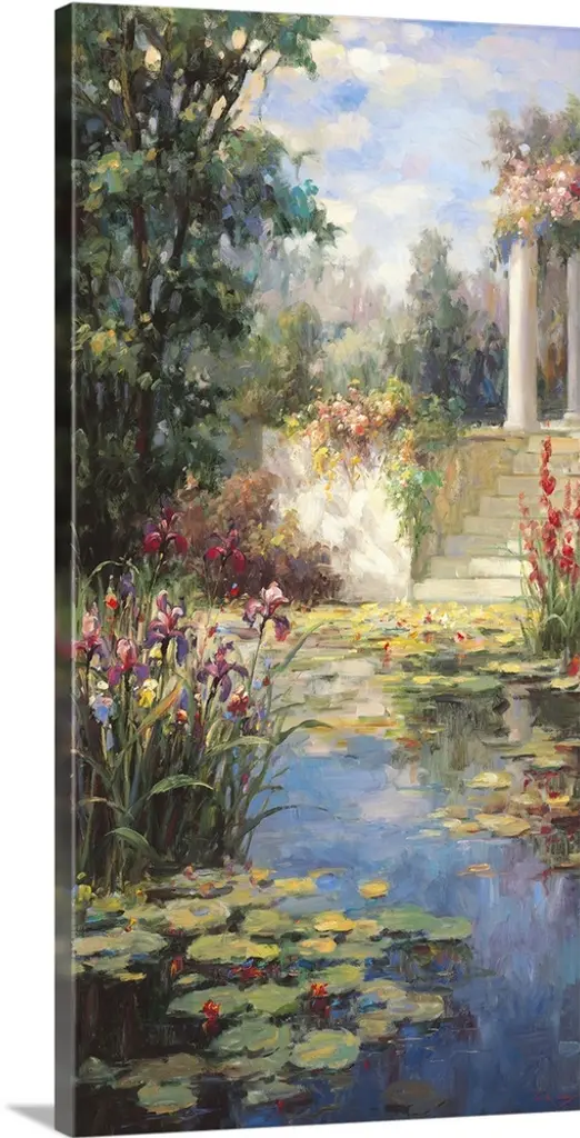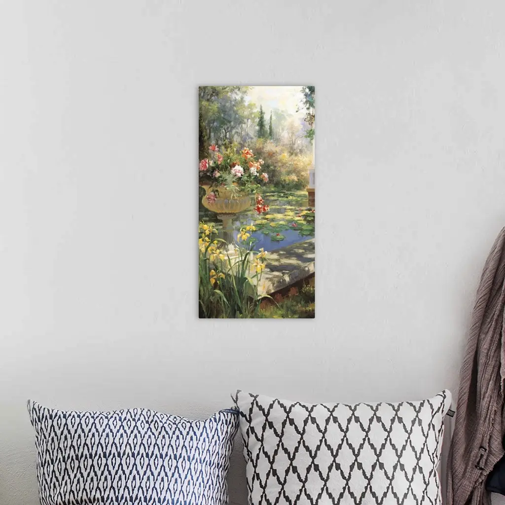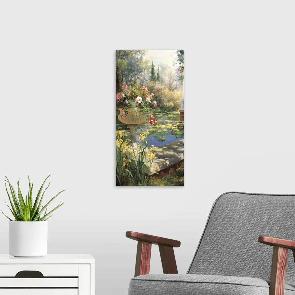 Painting of a pond in a garden with an urn full of flowers.