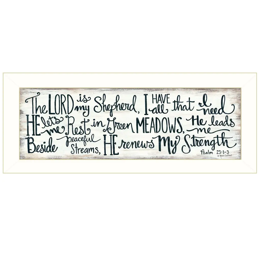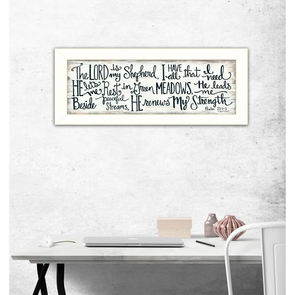 The the lord is my shepherd 2 white framed print wall art is the perfect decorative accessory for your home. This print is a visual artistic expression that allows you to decorate your space in style. Reproduced for you on paper, this hanging decorative accent will be a trendy and fashionable way to dress your walls. Adding this hanging wall art to your space to make your room feel more finished and attractive. Utilize this opportunity to create a focal point in the room with this fabulous wall decor option. 8" H x 20" W x 1" D