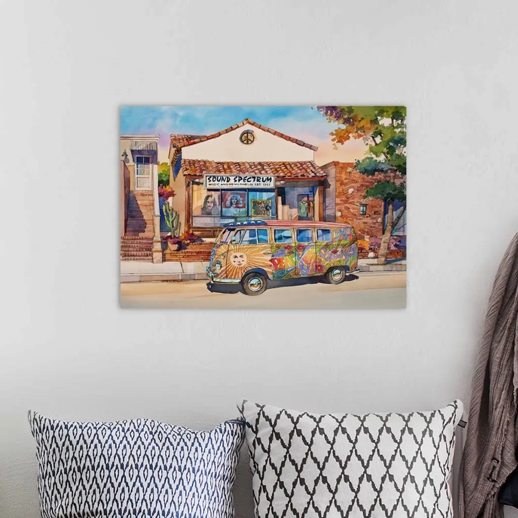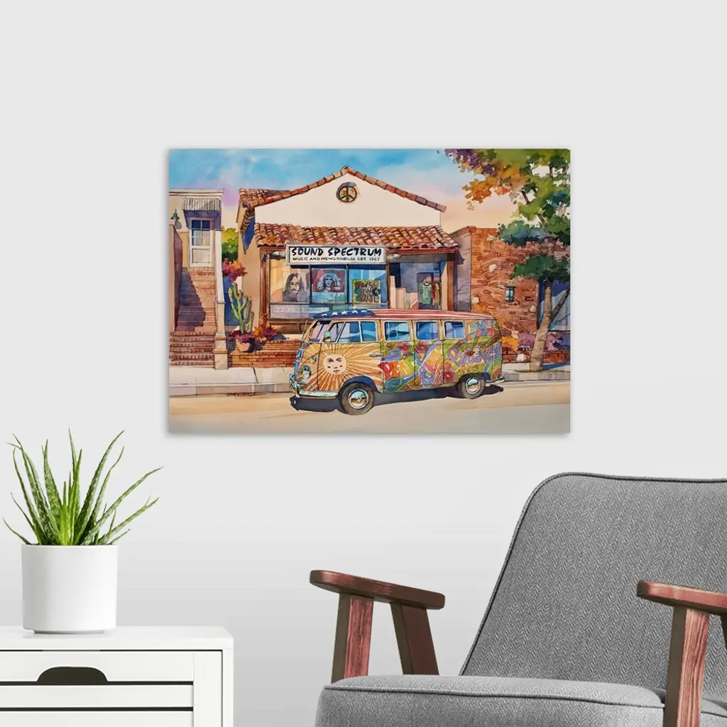 Watercolor painting of a painted VW Bus parked in front of Sound Spectrum music and memorabilia store.