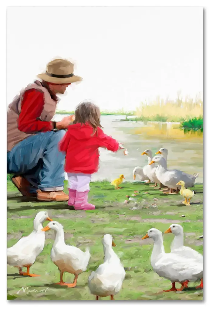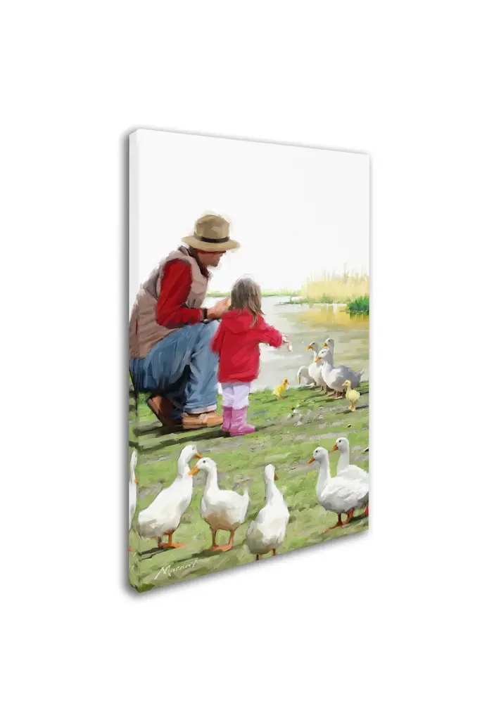 Artist: The Macneil StudioSubject: PeopleStyle: Modern & ContemporaryProduct Type: Gallery-Wrapped Canvas ArtMade in USAThis ready to hang, gallery-wrapped art piece features a man and his daughter feeding ducks by the pond.Richard Macneil, a self taught artist, formed The Macneil Studio in 2009 with his wife Judi and their sons Daniel and Kyle. Born in Winchester, Macneil started his working life as an artist at Worcester Royal Porcelain and has always worked in the fields of sculpture, ceramics, and illustration, both in the UK and internationally. He spent many years living on the east coast of the USA, then returned to Worcestershire and freelanced as an artist and greeting card designer. Richard spends any spare time he has with his family walking in the beautiful British countryside and fishing.Giclee (jee-clay) is an advanced printmaking process for creating high quality fine art reproductions. The attainable excellence that Giclee printmaking affords makes the reproduction virtually indistinguishable from the original piece. The result is wide acceptance of Giclee by galleries, museums, and private collectors. Gallery wrap is a method of stretching an artist's canvas so that the canvas wraps around the sides and is secured a hidden, wooden frame. This method of stretching and preparing a canvas allows for a frameless presentation of the finished painting.