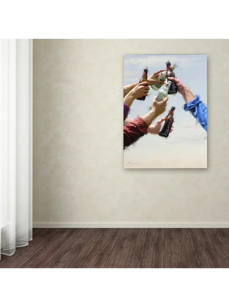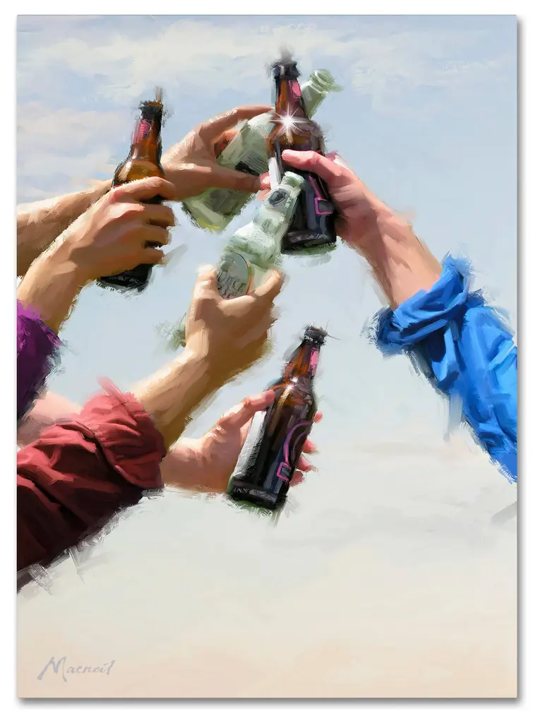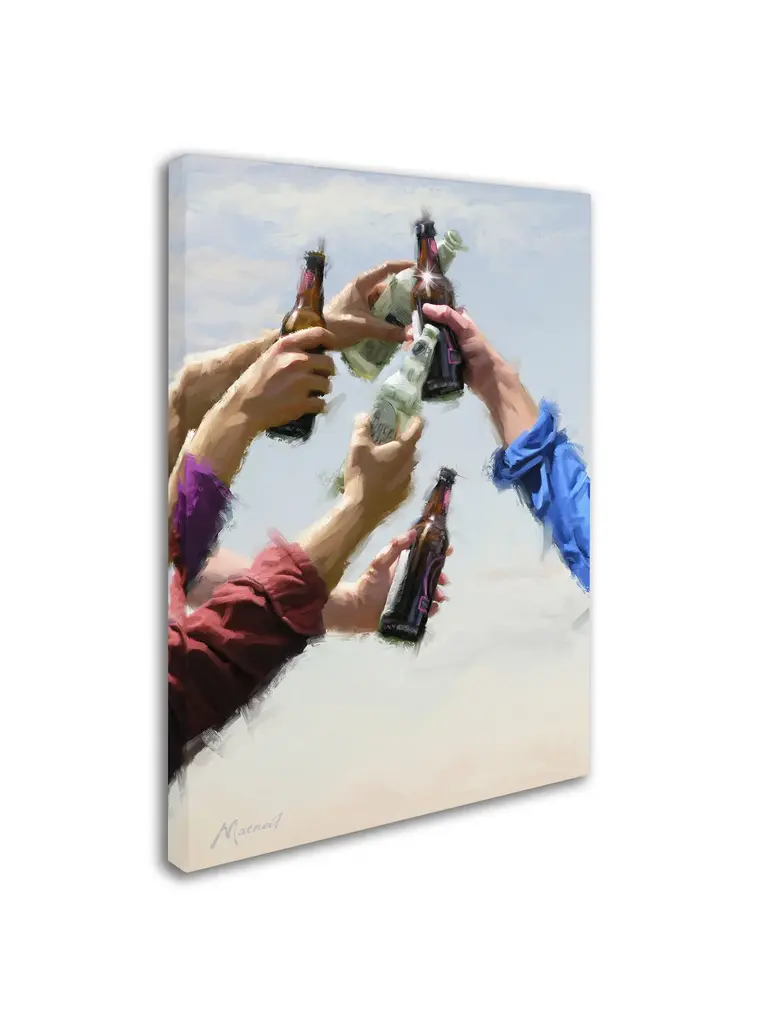 Artist: The Macneil StudioSubject: PeopleStyle: Modern & ContemporaryProduct Type: Gallery-Wrapped Canvas ArtMade in USAThis ready to hang, gallery-wrapped art piece features a group of people toasting with bottles of beer.Richard Macneil, a self taught artist, formed The Macneil Studio in 2009 with his wife Judi and their sons Daniel and Kyle. Born in Winchester, Macneil started his working life as an artist at Worcester Royal Porcelain and has always worked in the fields of sculpture, ceramics, and illustration, both in the UK and internationally. He spent many years living on the east coast of the USA, then returned to Worcestershire and freelanced as an artist and greeting card designer. Richard spends any spare time he has with his family walking in the beautiful British countryside and fishing.Giclee (jee-clay) is an advanced printmaking process for creating high quality fine art reproductions. The attainable excellence that Giclee printmaking affords makes the reproduction virtually indistinguishable from the original piece. The result is wide acceptance of Giclee by galleries, museums, and private collectors. Gallery wrap is a method of stretching an artist's canvas so that the canvas wraps around the sides and is secured a hidden, wooden frame. This method of stretching and preparing a canvas allows for a frameless presentation of the finished painting.