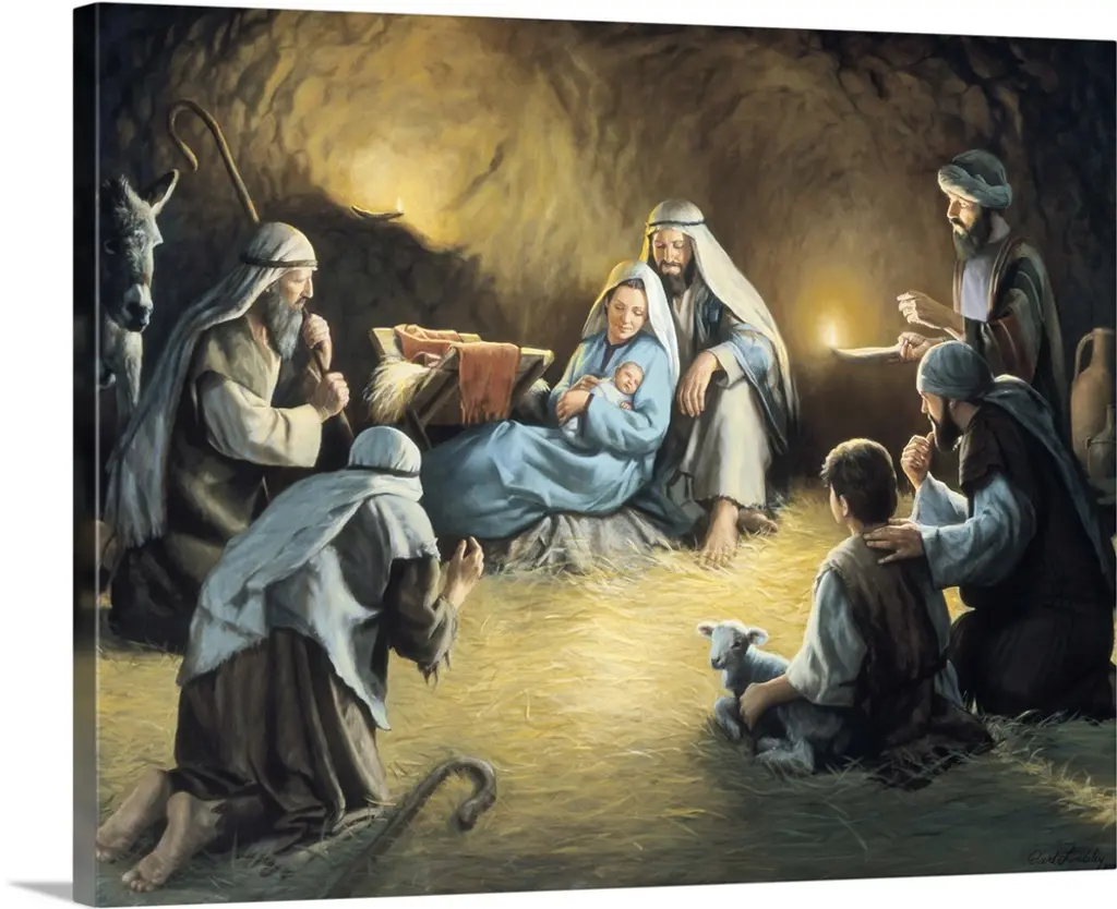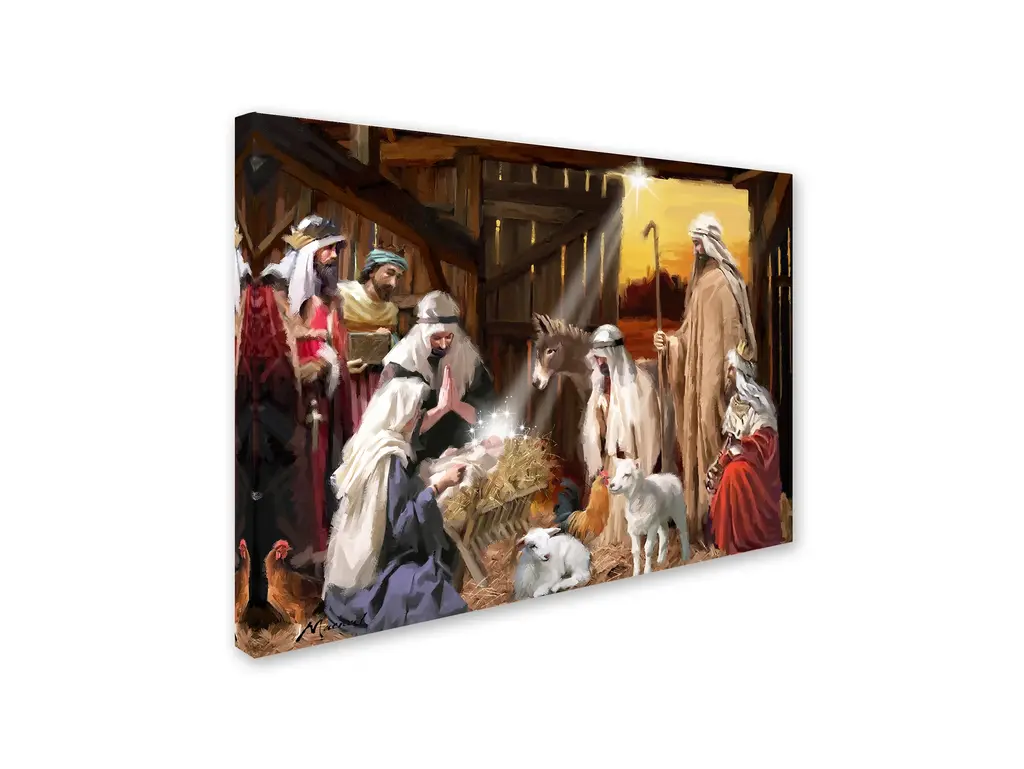 Artist: The Macneil StudioSubject: PeopleStyle: Modern & ContemporaryProduct Type: Gallery-Wrapped Canvas ArtMade in USAThis ready to hang, gallery-wrapped art piece features Mary, Joseph, and the three kings admiring Jesus in the manger.Richard Macneil, a self taught artist, formed The Macneil Studio in 2009 with his wife Judi and their sons Daniel and Kyle. Born in Winchester, Macneil started his working life as an artist at Worcester Royal Porcelain and has always worked in the fields of sculpture, ceramics, and illustration, both in the UK and internationally. He spent many years living on the east coast of the USA, then returned to Worcestershire and freelanced as an artist and greeting card designer. Richard spends any spare time he has with his family walking in the beautiful British countryside and fishing.Giclee (jee-clay) is an advanced printmaking process for creating high quality fine art reproductions. The attainable excellence that Giclee printmaking affords makes the reproduction virtually indistinguishable from the original piece. The result is wide acceptance of Giclee by galleries, museums, and private collectors. Gallery wrap is a method of stretching an artist's canvas so that the canvas wraps around the sides and is secured a hidden, wooden frame. This method of stretching and preparing a canvas allows for a frameless presentation of the finished painting.