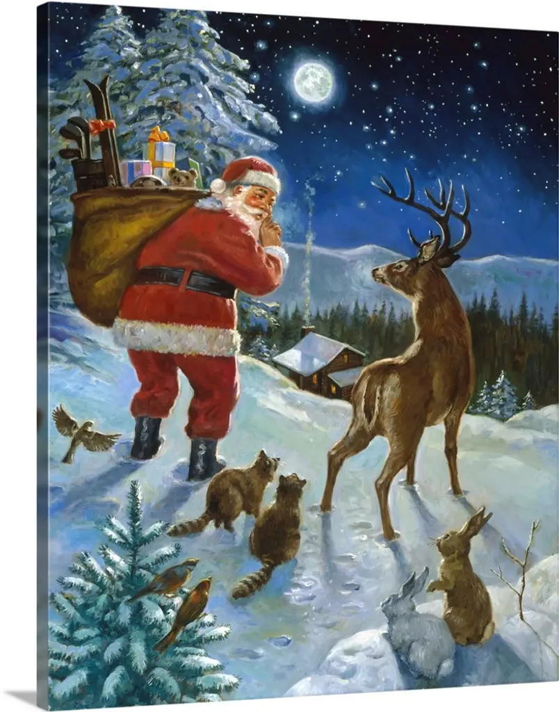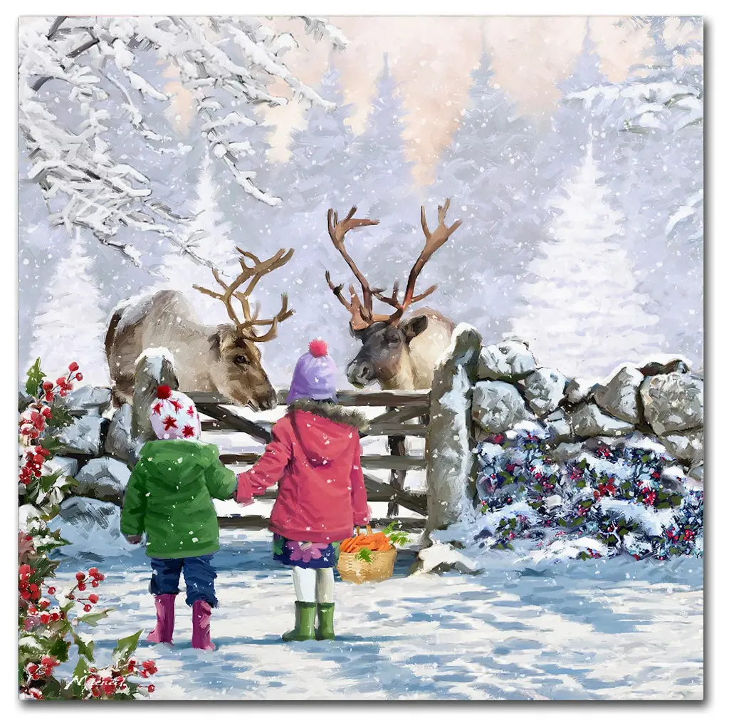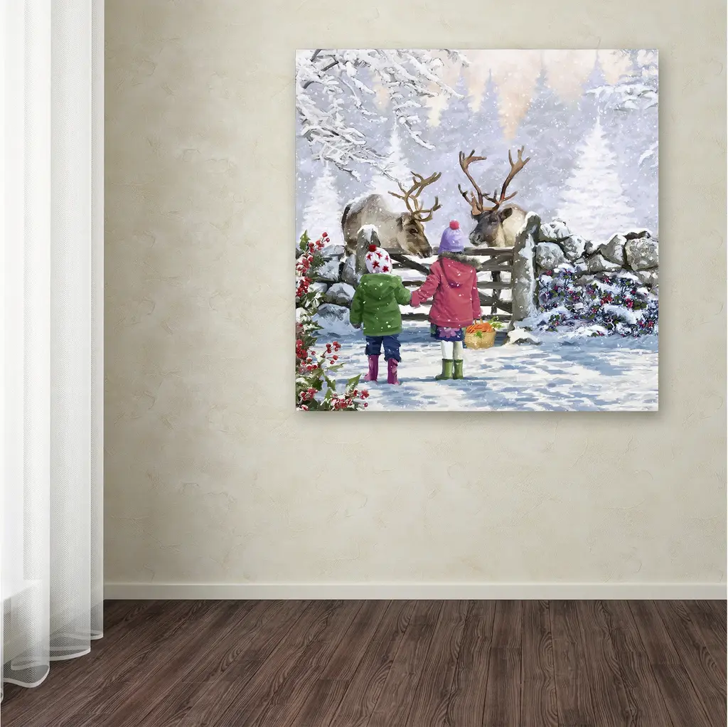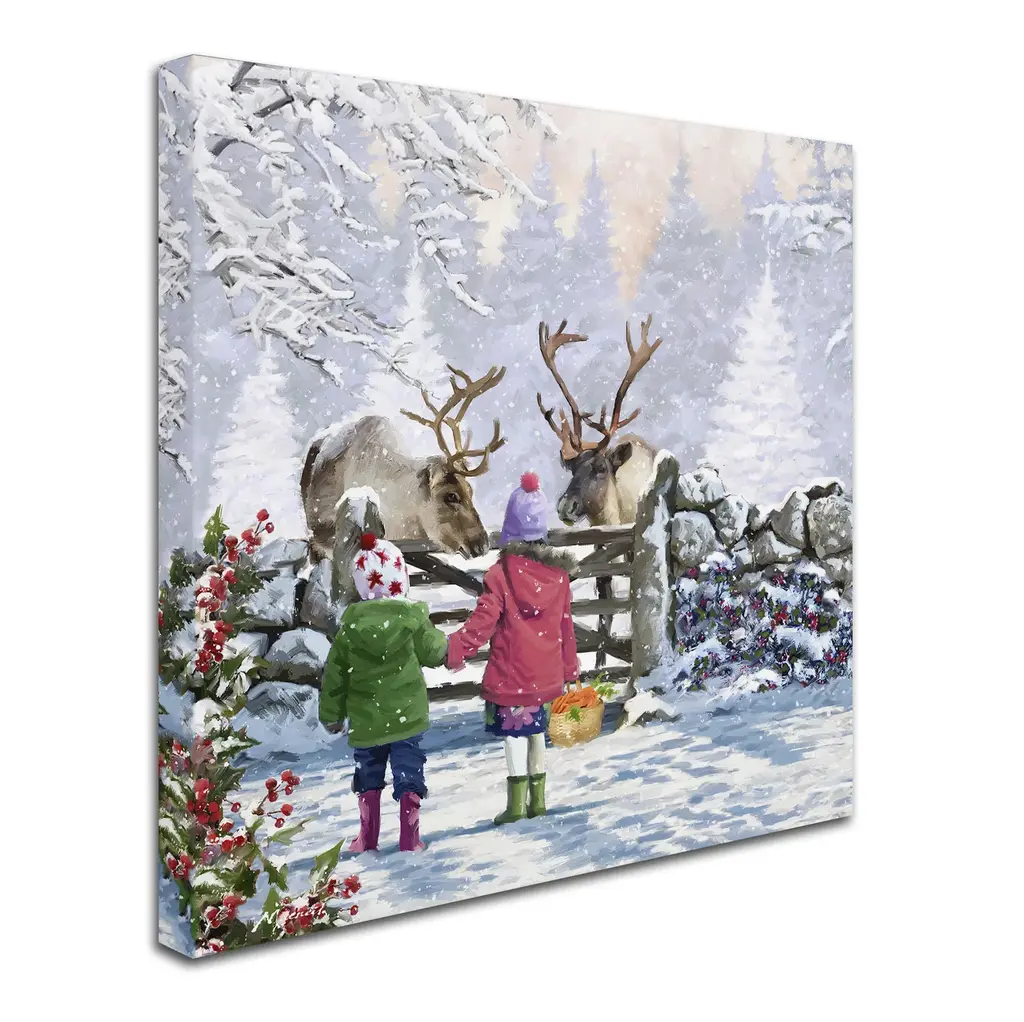 Artist: The Macneil StudioSubject: AnimalsStyle: Modern & ContemporaryProduct Type: Gallery-Wrapped Canvas ArtMade in USAThis ready to hang, gallery-wrapped art piece features two children admiring a pair of reindeer.Richard Macneil, a self taught artist, formed The Macneil Studio in 2009 with his wife Judi and their sons Daniel and Kyle. Born in Winchester, Macneil started his working life as an artist at Worcester Royal Porcelain and has always worked in the fields of sculpture, ceramics, and illustration, both in the UK and internationally. He spent many years living on the east coast of the USA, then returned to Worcestershire and freelanced as an artist and greeting card designer. Richard spends any spare time he has with his family walking in the beautiful British countryside and fishing.Giclee (jee-clay) is an advanced printmaking process for creating high quality fine art reproductions. The attainable excellence that Giclee printmaking affords makes the reproduction virtually indistinguishable from the original piece. The result is wide acceptance of Giclee by galleries, museums, and private collectors. Gallery wrap is a method of stretching an artist's canvas so that the canvas wraps around the sides and is secured a hidden, wooden frame. This method of stretching and preparing a canvas allows for a frameless presentation of the finished painting.