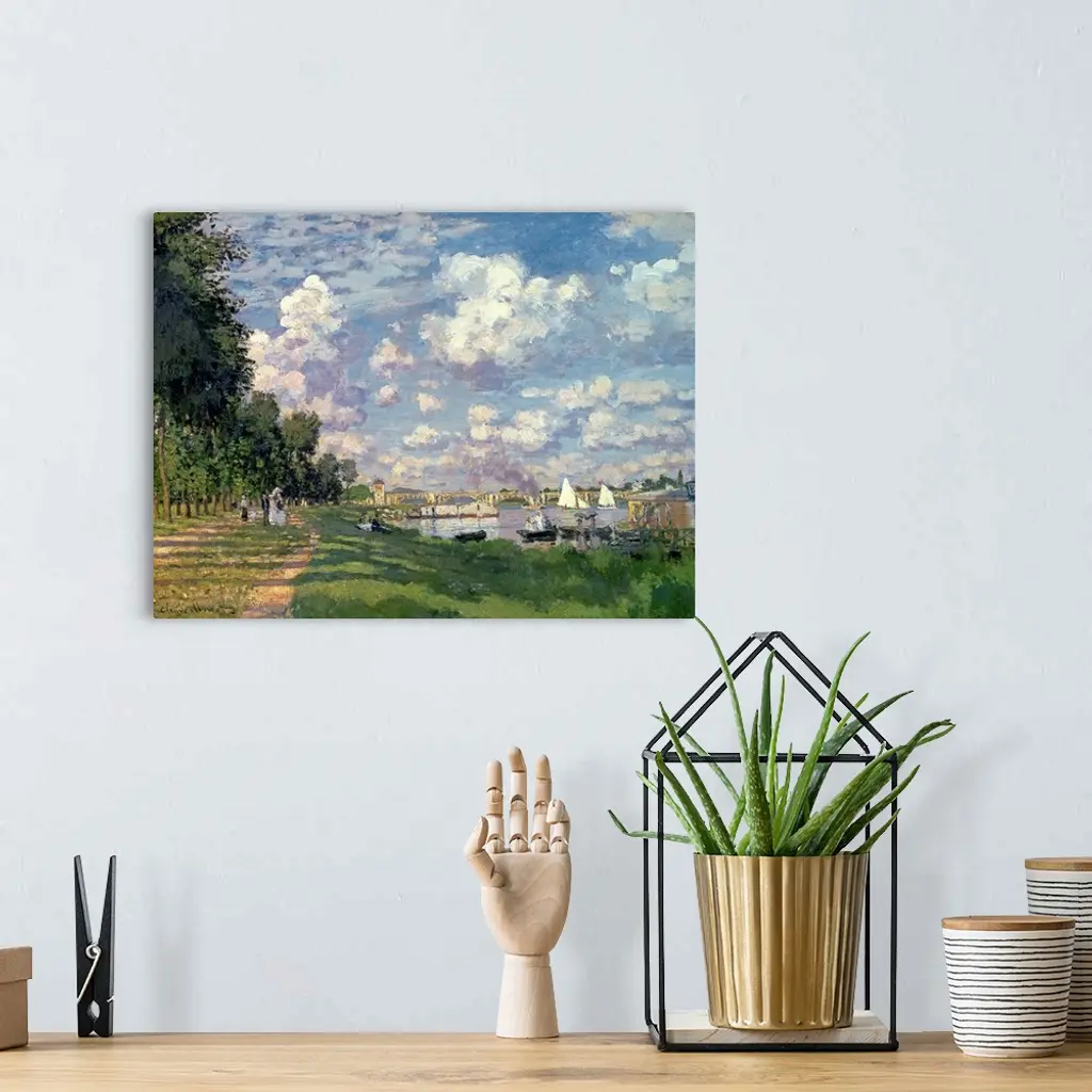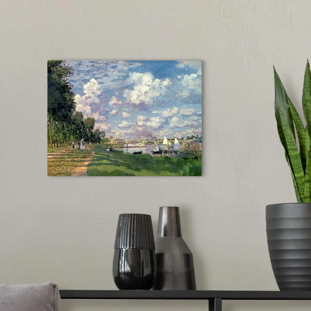 This wall art is a landscape painting of a river scene by an Impressionist master showing a road lined with trees and a river full of sail, steam, and row boats.