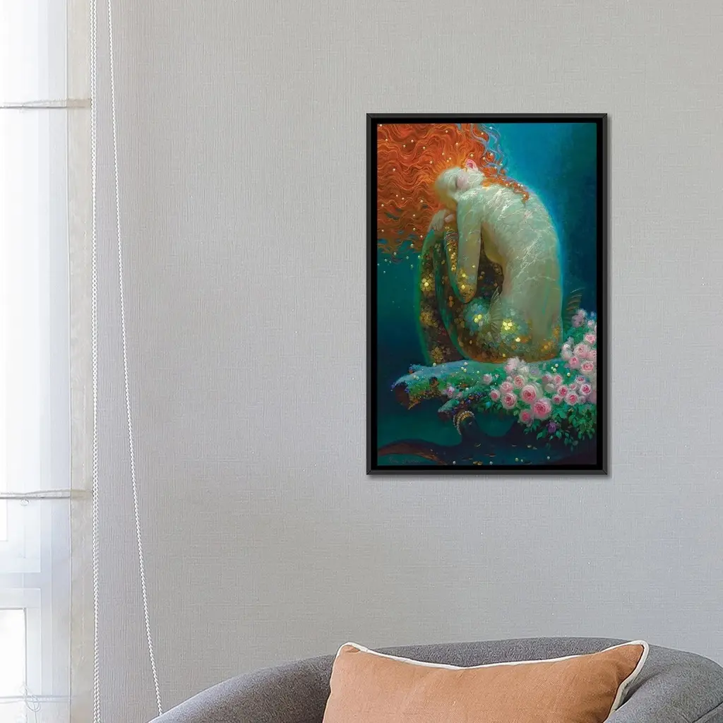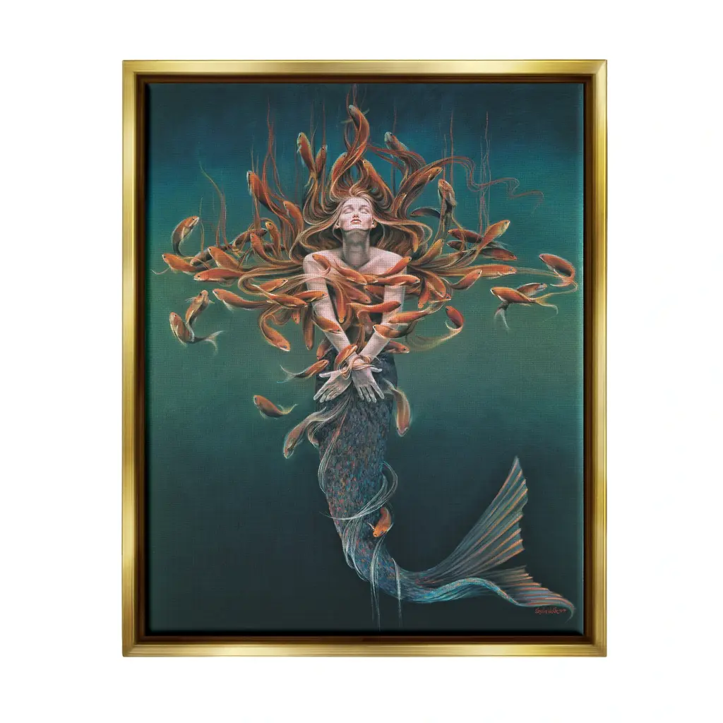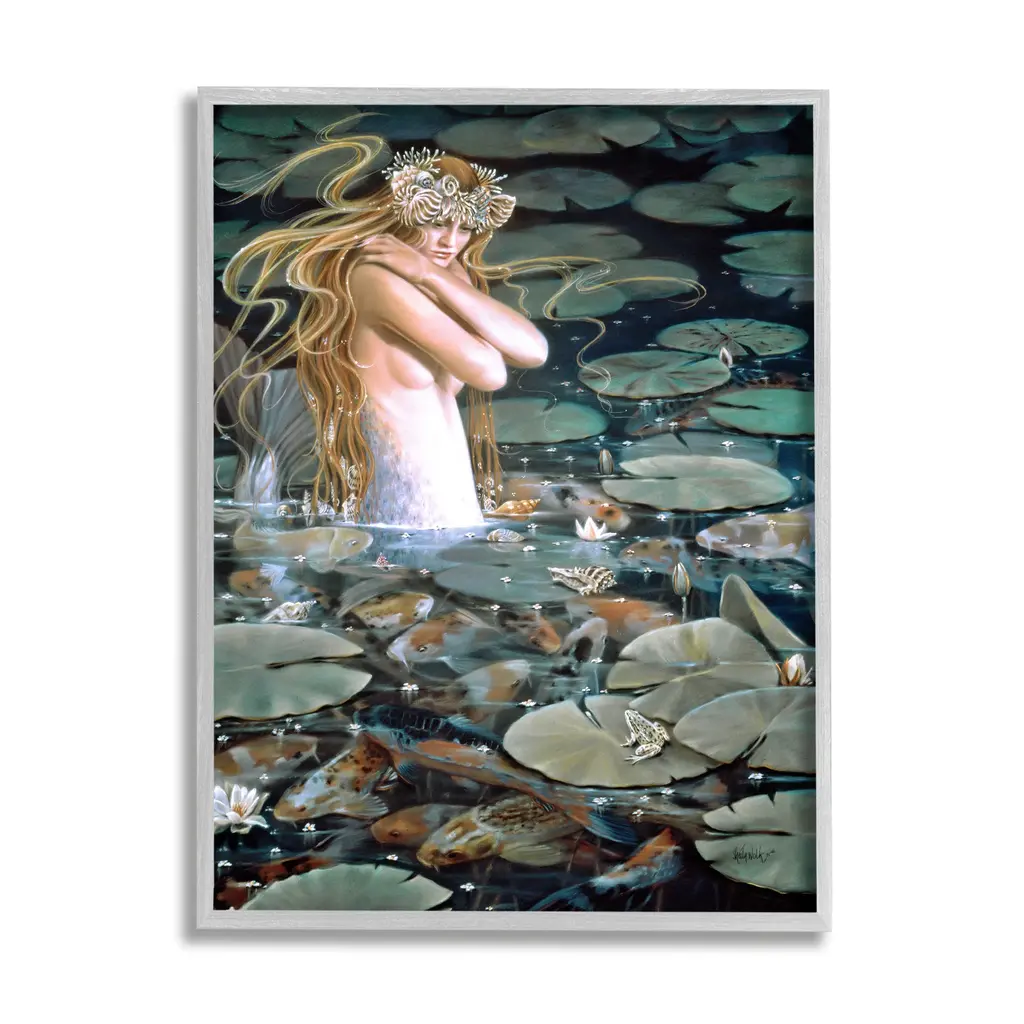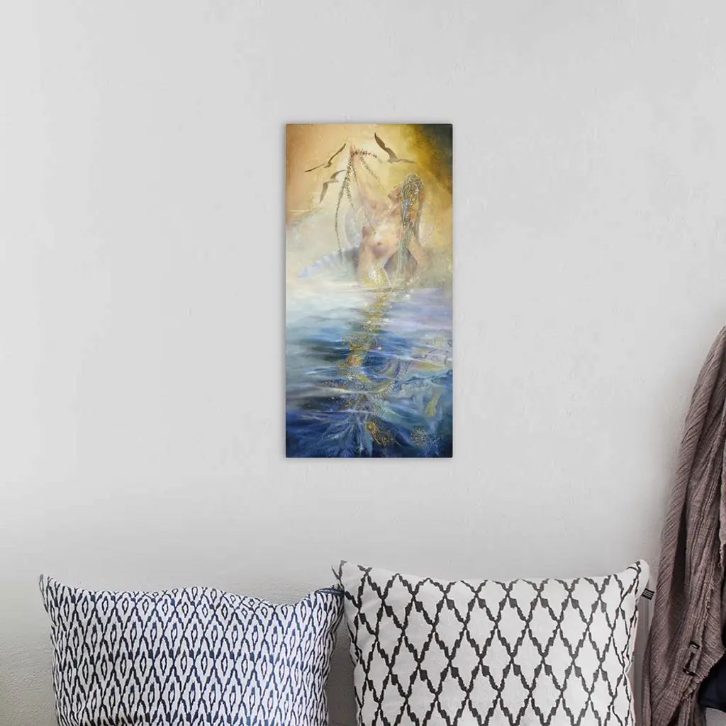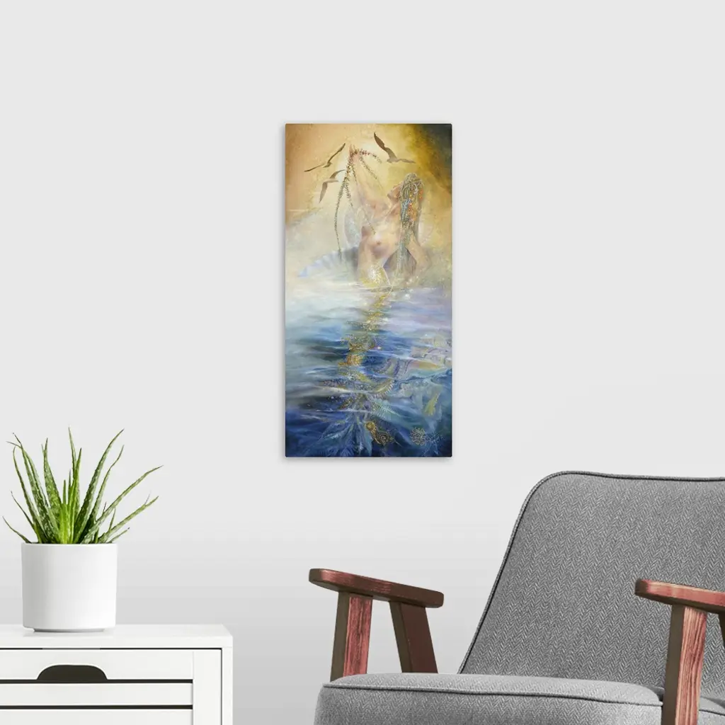 A contemporary painting of a Mermaid breaching the surface of the water she resides in.