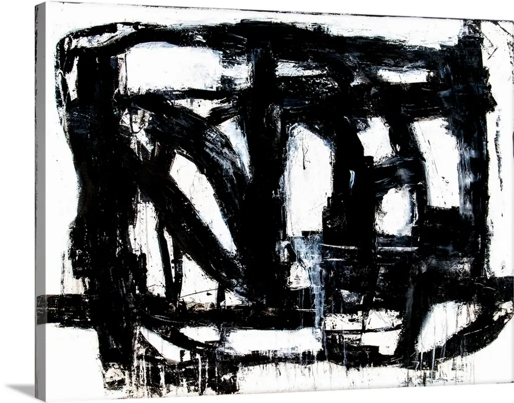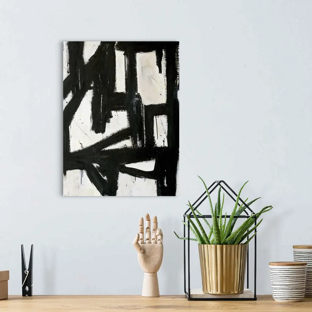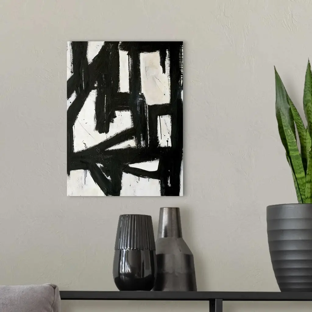 Contemporary abstract painting with thick black lines on white.