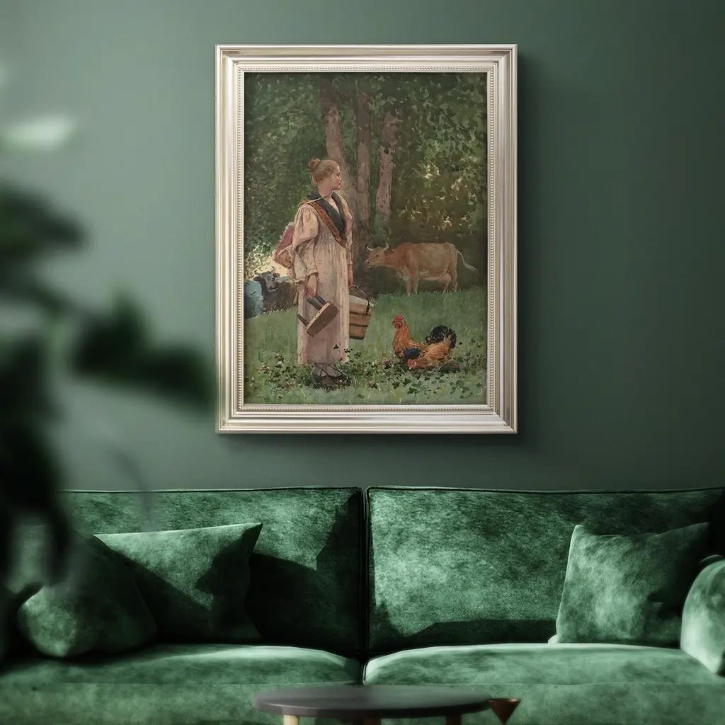 The Milk Maid Premium Framed Canvas- Ready to Hang A Premium Framed Canvas created to last. Framed in distressed wood and available in an array of sizes and colors Featuring a beveled a solid wood stretcher bar, each piece comes ready to hand 3 SIZES AVAILABLE 16''X20'' - Overall Size 18'X27'' - Overall Size 24''x36'' - Overall Size Each piece is made to order. Each piece comes with hanging hardware. Made in the USA Ready to Hang Giclee Paper Print Acrylic Glass Beveled Matt Board