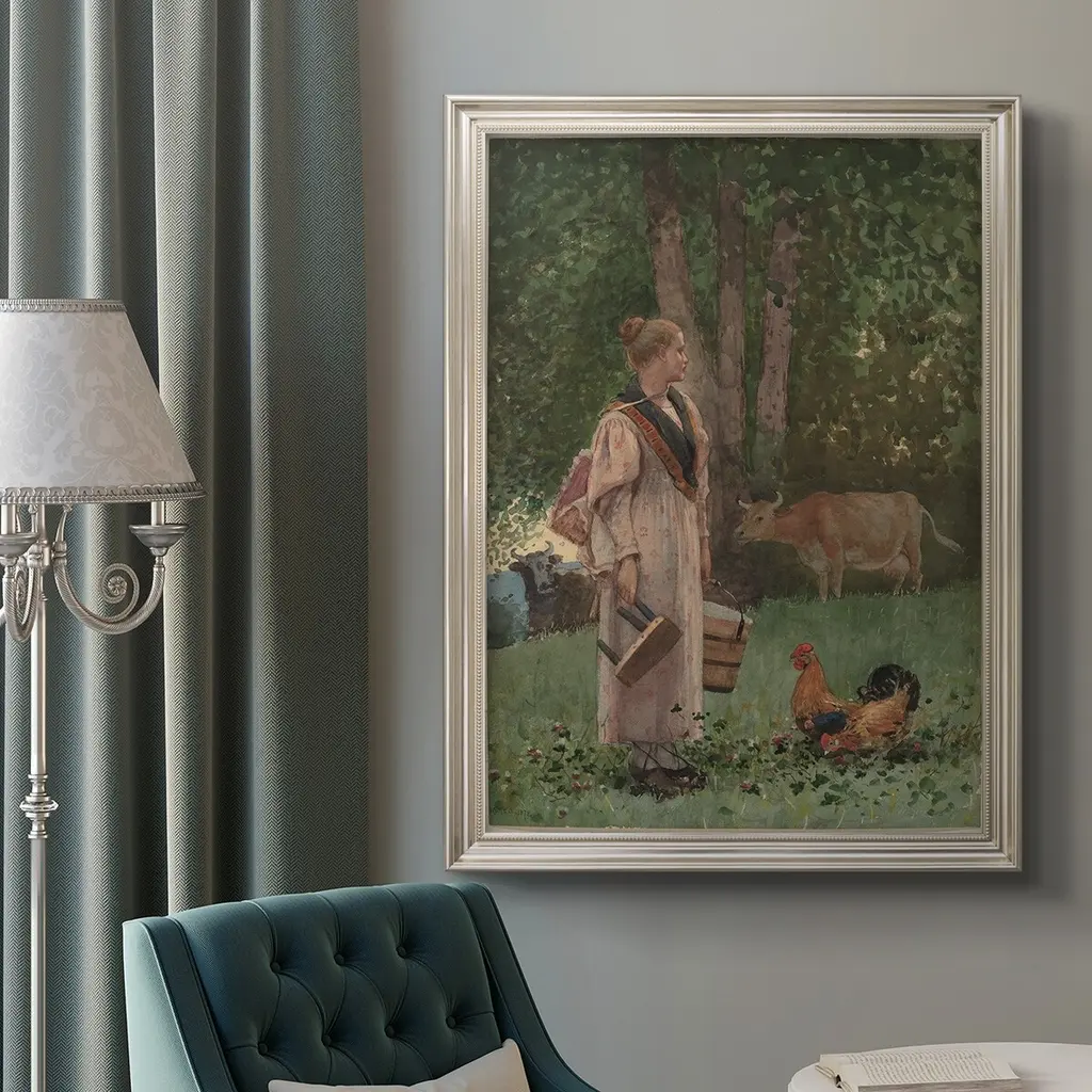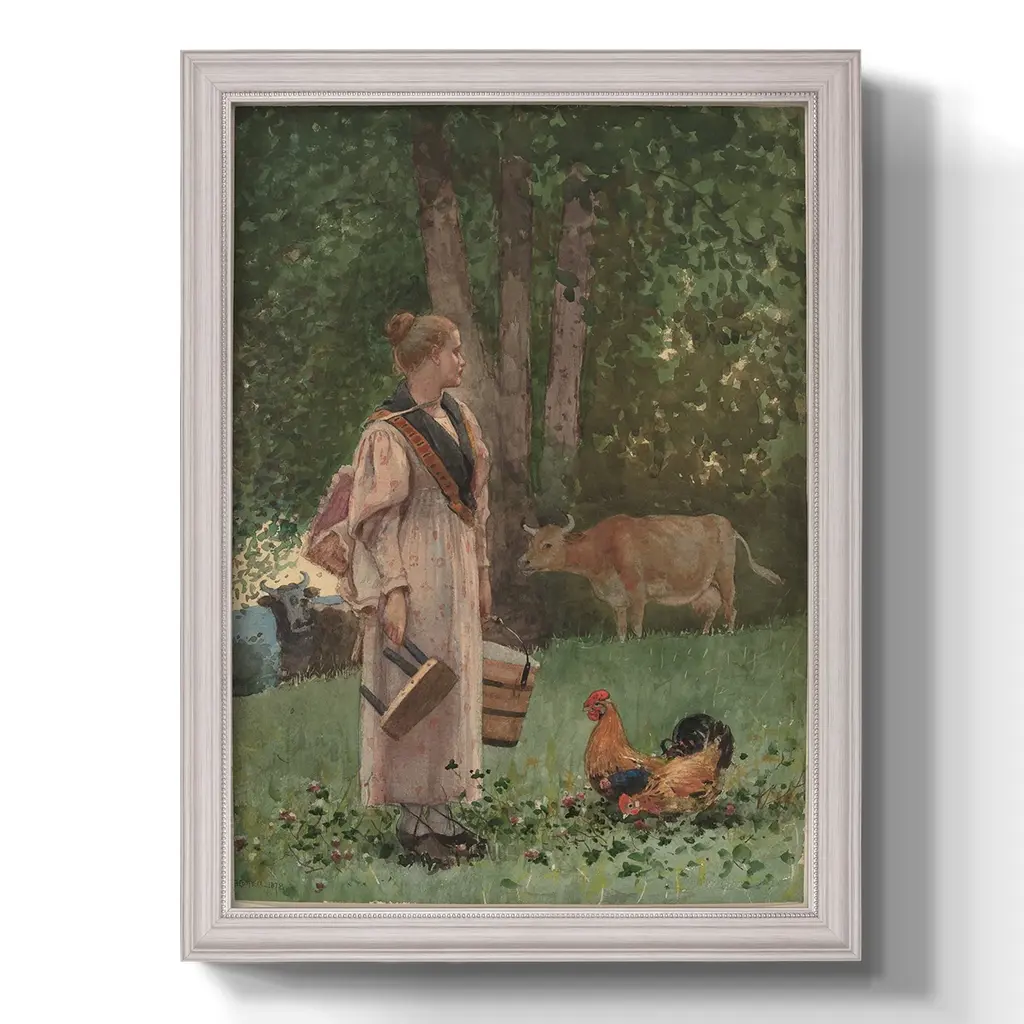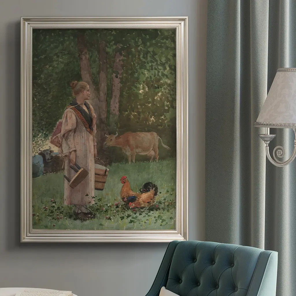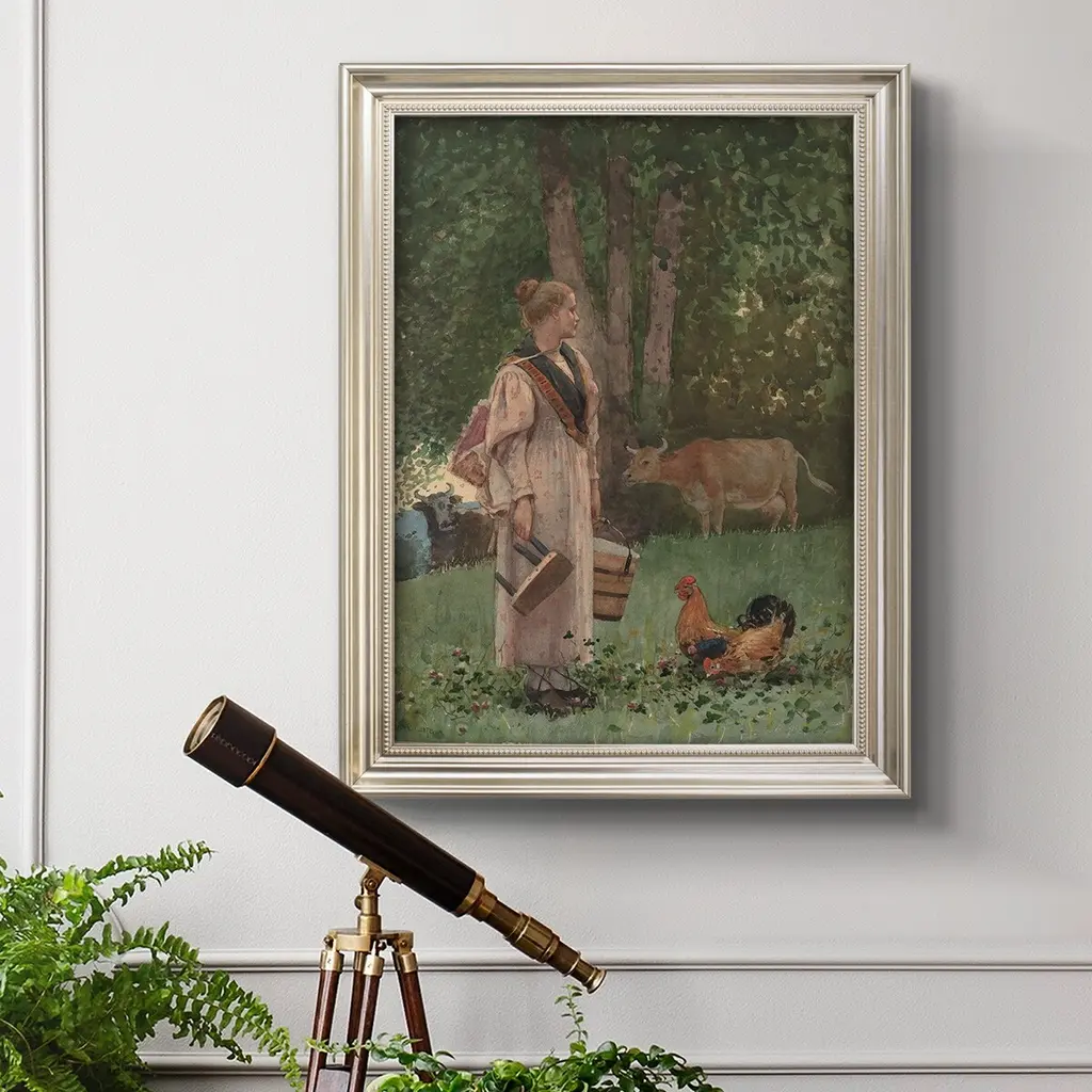 The Milk Maid Premium Framed Canvas- Ready to Hang A Premium Framed Canvas created to last. Framed in distressed wood and available in an array of sizes and colors Featuring a beveled a solid wood stretcher bar, each piece comes ready to hand 3 SIZES AVAILABLE 16''X20'' - Overall Size 18'X27'' - Overall Size 24''x36'' - Overall Size Each piece is made to order. Each piece comes with hanging hardware. Made in the USA Ready to Hang Giclee Paper Print Acrylic Glass Beveled Matt Board