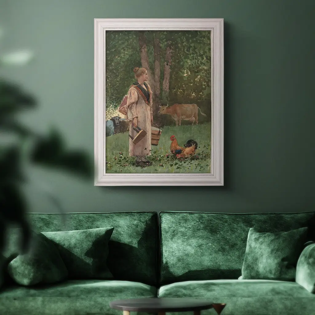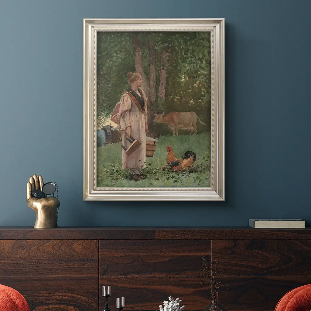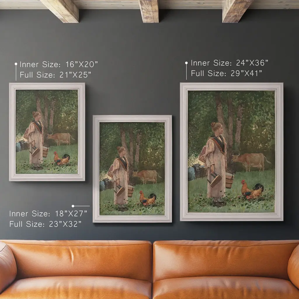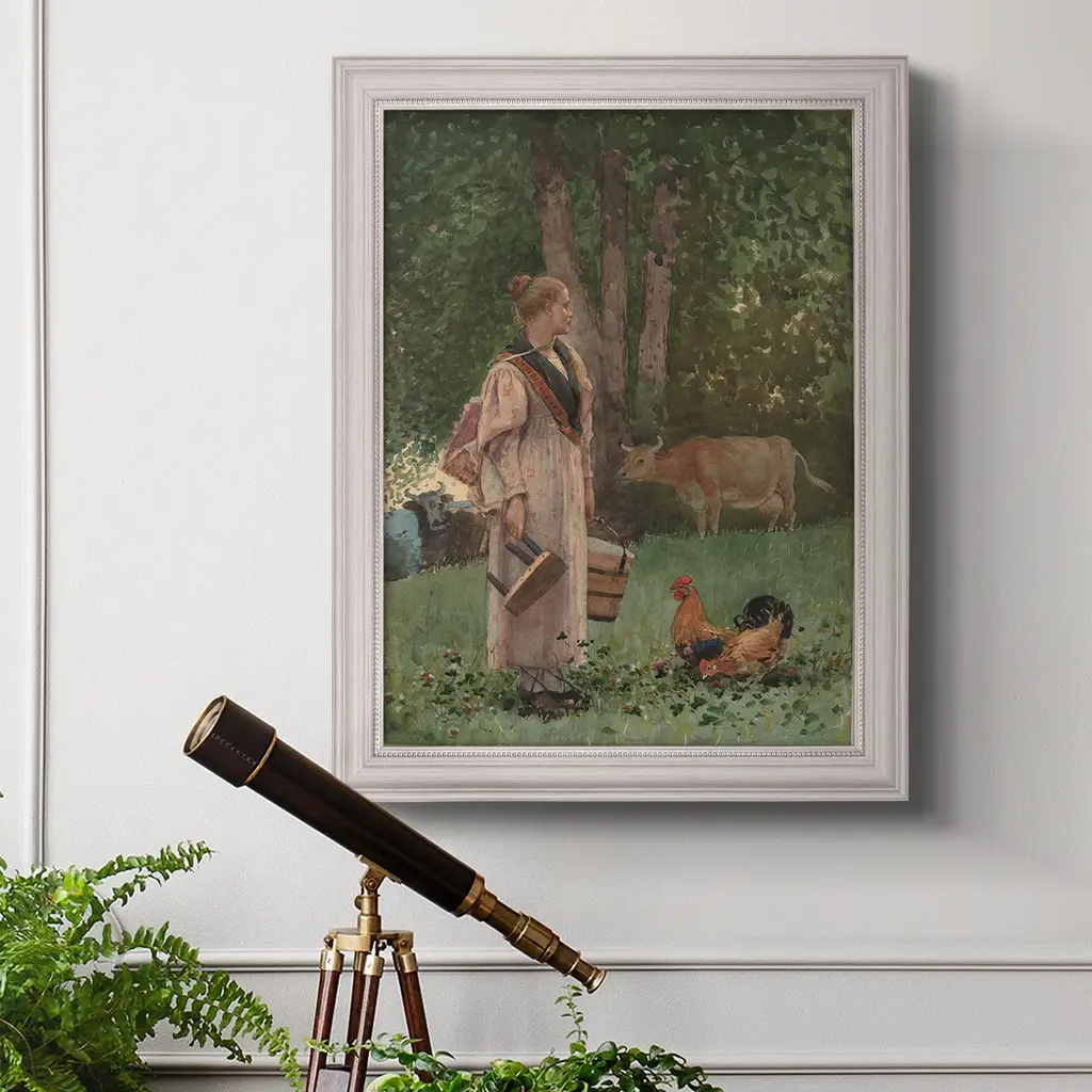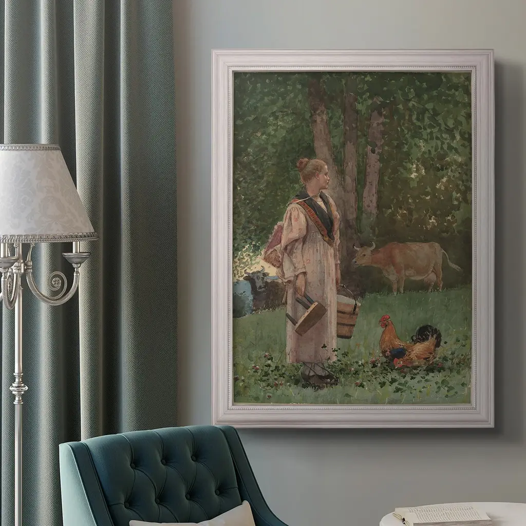 The Milk Maid Premium Framed Canvas- Ready to Hang A Premium Framed Canvas created to last. Framed in distressed wood and available in an array of sizes and colors Featuring a beveled a solid wood stretcher bar, each piece comes ready to hand 3 SIZES AVAILABLE 16''X20'' - Overall Size 18'X27'' - Overall Size 24''x36'' - Overall Size Each piece is made to order. Each piece comes with hanging hardware. Made in the USA Ready to Hang Giclee Paper Print Acrylic Glass Beveled Matt Board